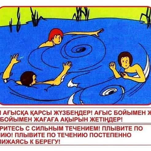 ⚠️ Егер де ағысы қатты суға түсіп кетсең, ағысқа қарсы жүзуге тырыспа, оған шамаң жетпейді. Мұндай жағдайда жағаға жақындайтындай болып ағыс бойымен жүзуің керек.