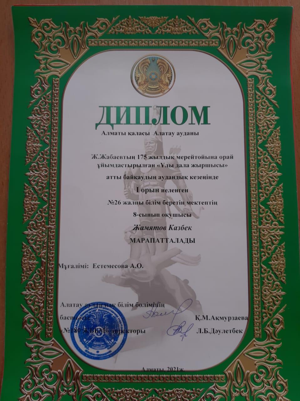 1)8-сынып оқушысы Жамятов Казбек І орынды иеленді.