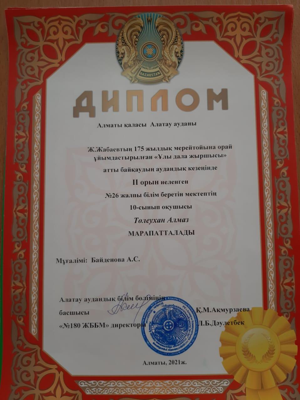 3) 10-сынып оқушысы Төлеухан Алмас ІІ орынды иеленді.