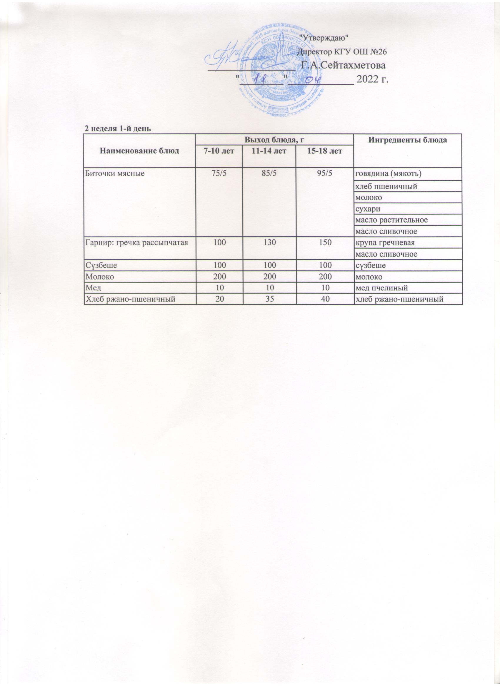ТӨРТ АПТАЛЫҚ АС МӘЗІРІНІҢ II- АПТАСЫНЫҢ 1-КҮНІ (11.04.2022)