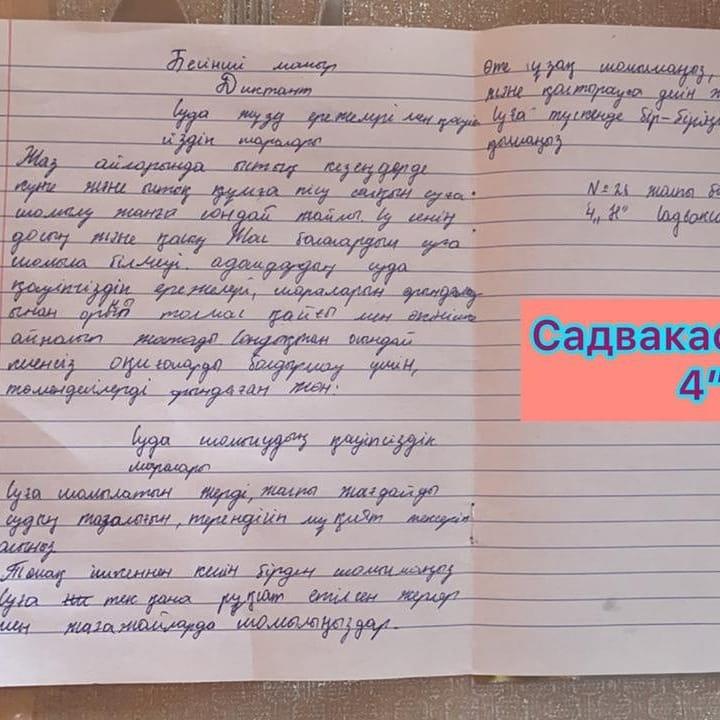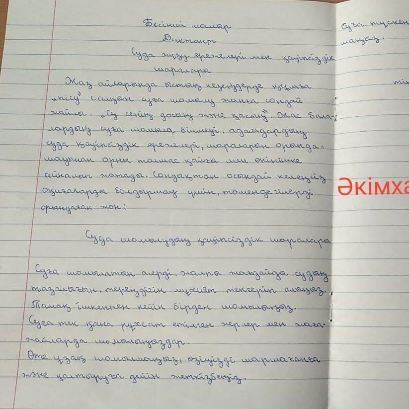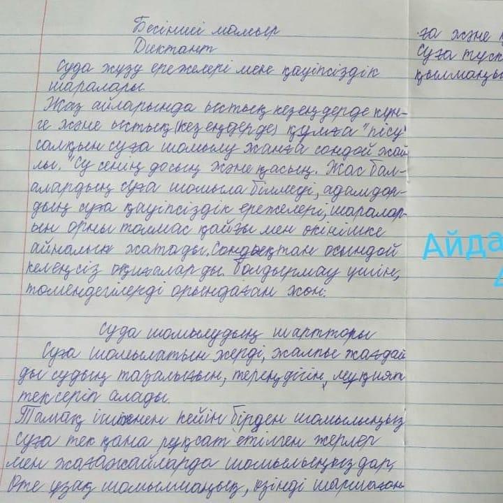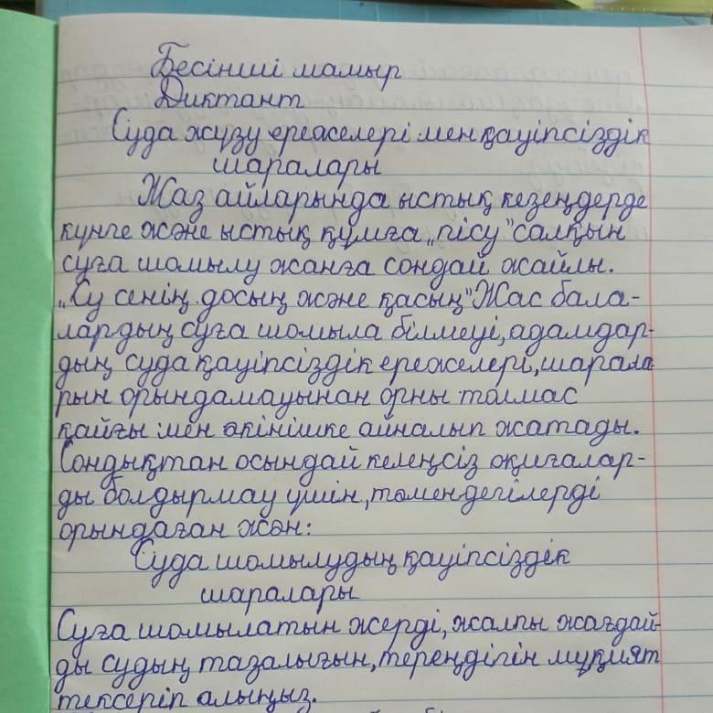 01 июнь 2021 0 1 2 3 4 5 "Судағы қауіпсіздік" тақырыбында диктант Алматықаласы Алатау ауданы № 26 жалпы білім беретін мектепте жоспарға сəйкес,4-сынып оқушылары "Судағы қауіпсіздік" тақырыбында диктант жазды.Мақсаты: оқушыларға өмір қауіпсіздігін, судағы қауіпсіздік шараларын түсіндіру;