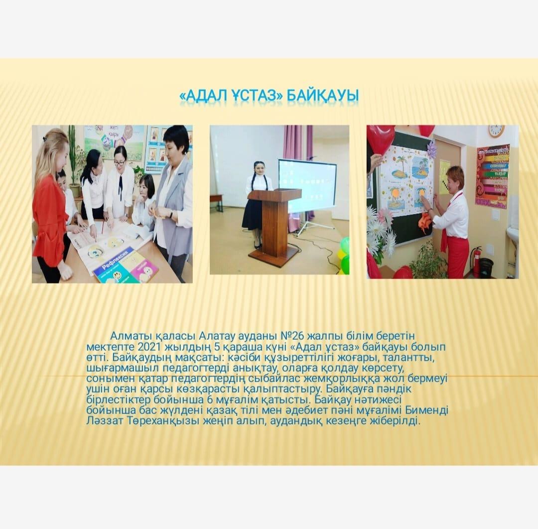 Алматы қаласы Алатау ауданы №26 жалпы білім беретін мектепте 2021 жылдың 5 қараша күні «Адал ұстаз» байқауы болып өтті. Байқаудың мақсаты: кәсіби құзыреттілігі жоғары, талантты, шығармашыл педагогтерді анықтау, оларға қолдау көрсету, сонымен қатар педагогтердің сыбайлас жемқорлыққа жол бермеуі ушін оған қарсы көзқарасты қалыптастыру. Байқауға пәндік бірлестіктер бойынша 6 мұғалім қатысты. Байқау нәтижесі бойынша бас жүлдені қазақ тілі мен әдебиет пәні мұғалімі Бименді Ләззат Төреханқызы жеңіп алып, аудандық кезеңге жіберілді.