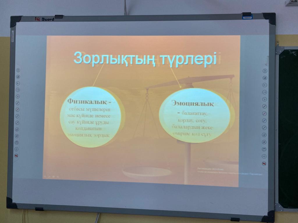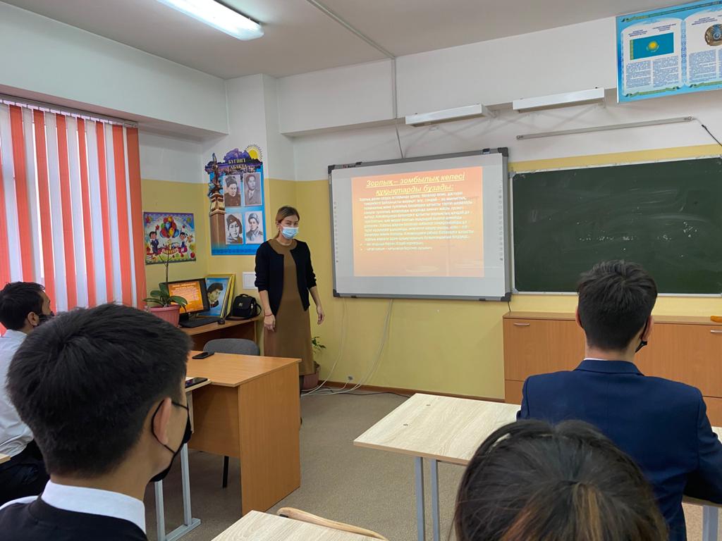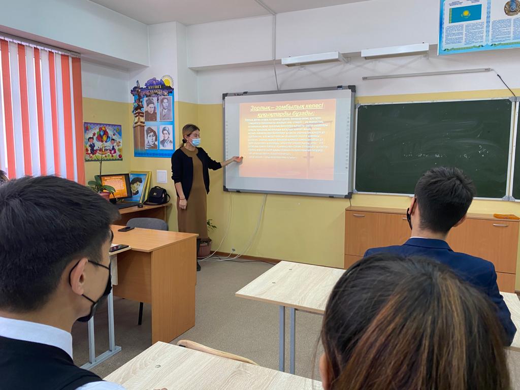 Алматы қаласы Алатау ауданы 26 жалпы білім беретін мектепте кәмелеттік жасқа толмағандар арасында “Зорлық-зомбылықты болдырмау” мақсатында 9,10,11 сыныптар арасында мектеп психологі Әйгерім Нысамбаева түсіндірме жұмыстарын жүргізді. Мақсаты: кәмелеттік жасқа толмағандар арасында күш көрсету, қорқыту, зорлық-зомбылықтың алдын алу.