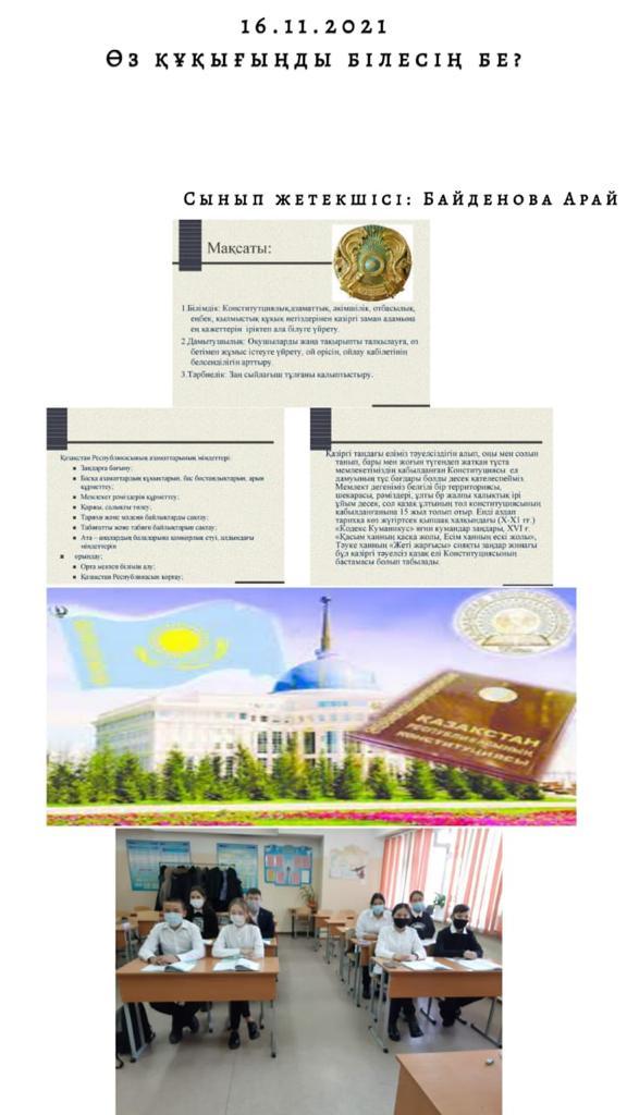 Мақсаты: білім алушыларға адам құқықтары мен бостандықтары жайлы баптардан түсінік қалыптастыру, құқықтық білімдерін толықтыру және ой өрісін дамыта отырып білім алушылардың бойына құқықтық, патриоттық,адамгершілік тәрбиені сіңіру.