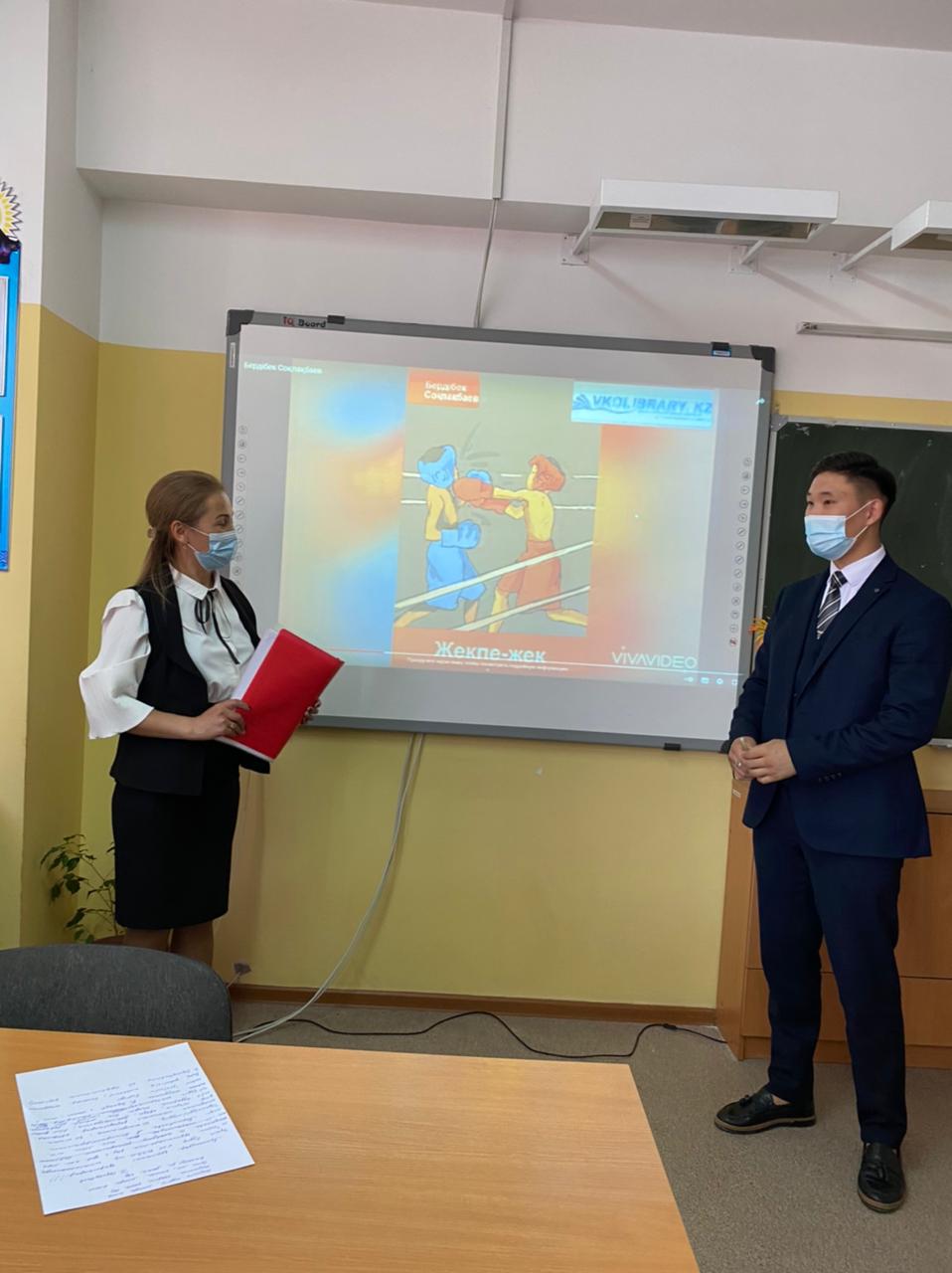 Қазақ тілі және әдебиет пән мұғалімі Жаканова Н нәзік, ауыл баласы Мұраттың үзбей жаттығу нәтижесінде спорт шыңына шыққанын дәріптеп, арман жолында қиындықтан қашпау керектігін ұғындырды және "Балалар әдебиеті—рухани қазына" атты кітап көрмесімен таныстырды. Шараны қазақ тілі және әдебиет пән мұғалімі Жақанова Н мен кітапхана меңгерушісі Мергенбаева А қорытындылап, қатысушыларға алғысын білдірді.