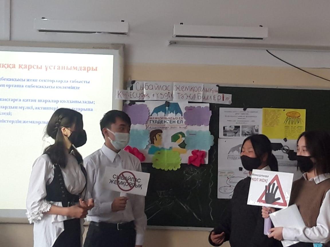 03.12.2021 жылы №26 жалпы білім беретін мектепте "Сыбайлас жемқорлық және қоғам. Жемқорлыққа жол жоқ!" тақырыбында дөңгелек үстел өткізілді.Мақсаты:“Сыбайлас жемқорлық” деген ұғымды түсіндіріп, пайда болу жағдайлары жайлы түсінік қалыптастыру. Қоғамдық қасіретке әкелетін бұл материалдық құндылықтар дағдарысынан шығу және оны жою дұрыс әрекет етуден туындайтынын ұғындыру;