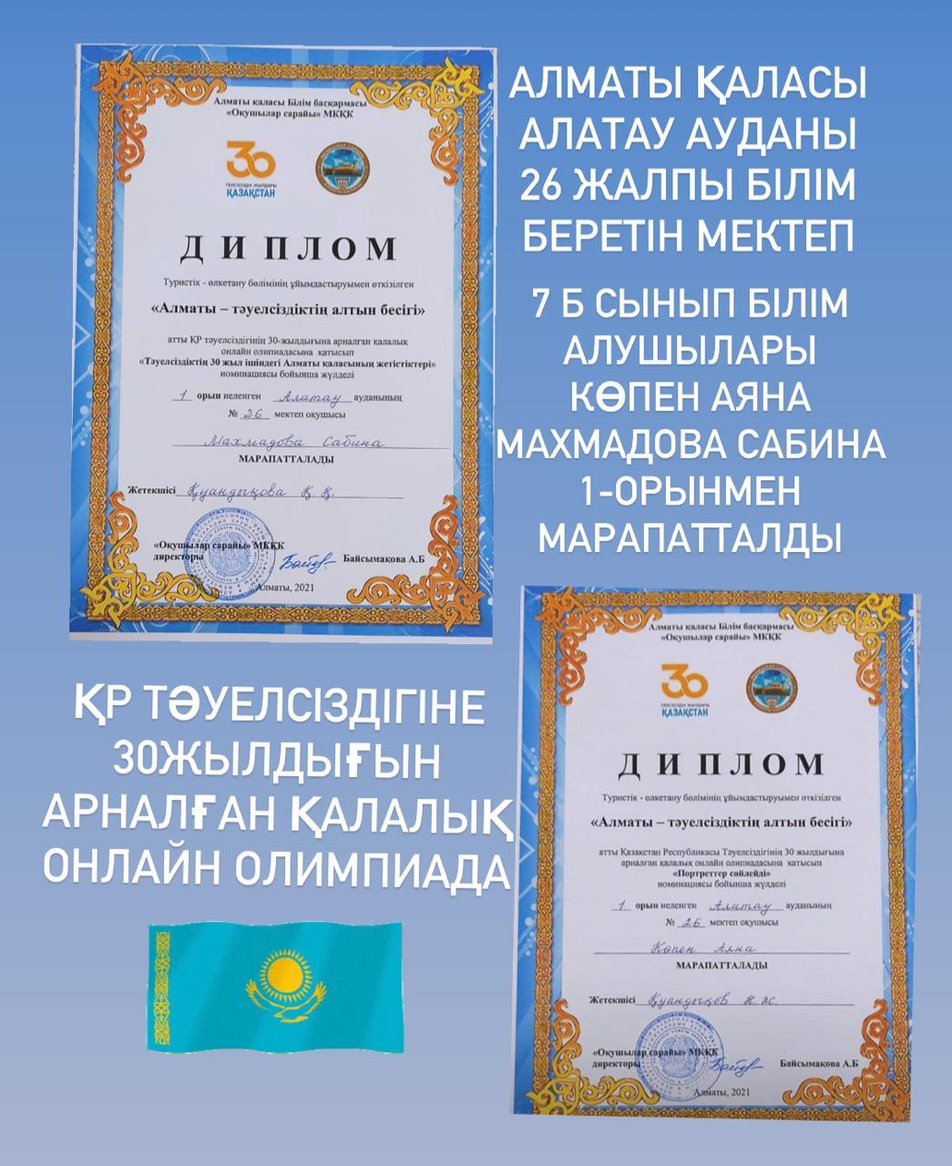“Алматы-тәуелсіздіктің алтын бесігі” атты ҚР тәуелсіздігінің 30 жылдығына арналған қалалық онлайн олимпиадасына қатысып