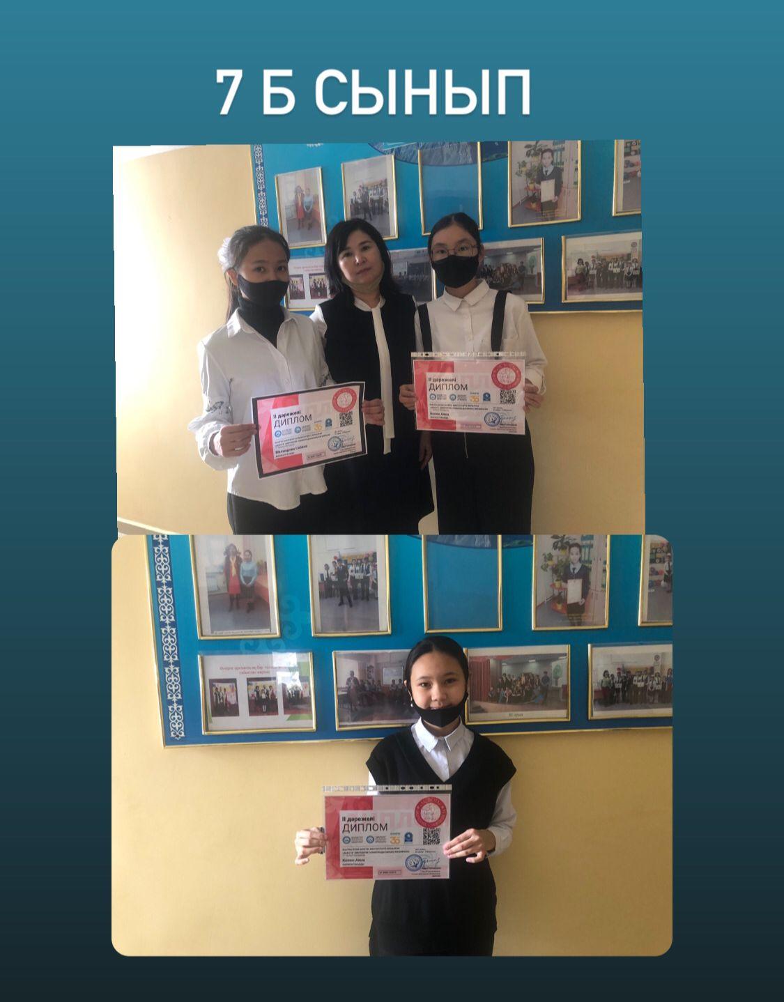 Қазақстан Республикасы Білім және ғылым министрлігі “Дарын Республикалық ғылыми практикалық орталығы ұйымдастырған жалпы білім беретін мектептерге арналған “Ақбота”зияткерлік олимпиадасының жеңімпаздары 7 "Б" сынып білім алушылары