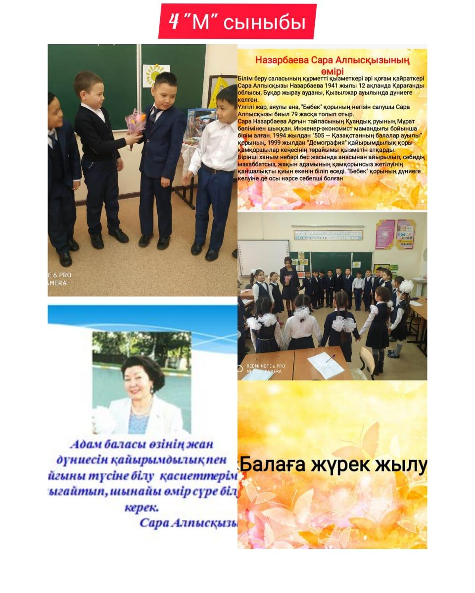 26 жалпы білім беретін мектепте 4 "М" сыныбында "Өзін-өзі тану" рухани адамгершілік бағдарламасының авторы Сара Алпысқызына арналған "Балаға жүрек жылуы" тақырыбында сынып сағаты өтті.