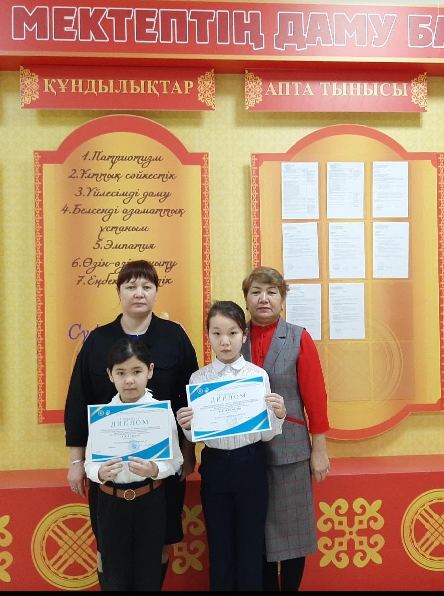 Айтбай Эльдана Болатқызы 2-7сынып оқушыларына арналған зерттеу жұмыстары мен шығармашылық жобаларының "ЗЕРДЕ" Республикалық конкурсының қалалық кезеңінің химия, биология секциясы бойынша жеңімпаздары атана отырып,