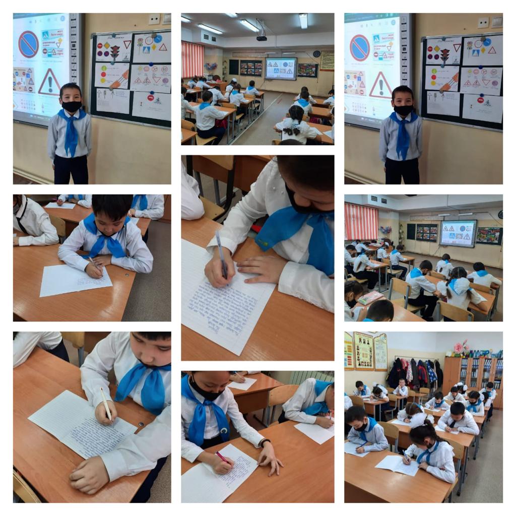 №26 жалпы білім беретін мектепте «Тиым салынатын белгілер», «Жол таңбалары» тақырбында шығарма жазды. 4 сыныптың білім алушылары өмірде күтпеген оқиғалардан сақтану үшін жол ережелеріне бағыну керек екенің өз ойларын білдіріп жазды.
