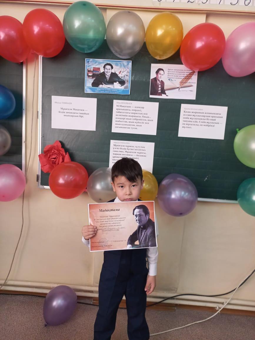 10 февраль 2022 0 1 2 3 4 5 "Мұқағали оқуларынан" Алматы қаласы Алатау ауданы 26 ЖББ мектептің бастауыш сыныптар арасында өткен "Мұқағали оқуларынан" мәнерлеп оқу сайысында 1"А" сынып оқушысы Сулейман Айсултан І- орынды жеңіп алдыСынып жетекшісі: Алияскарова А.Б.