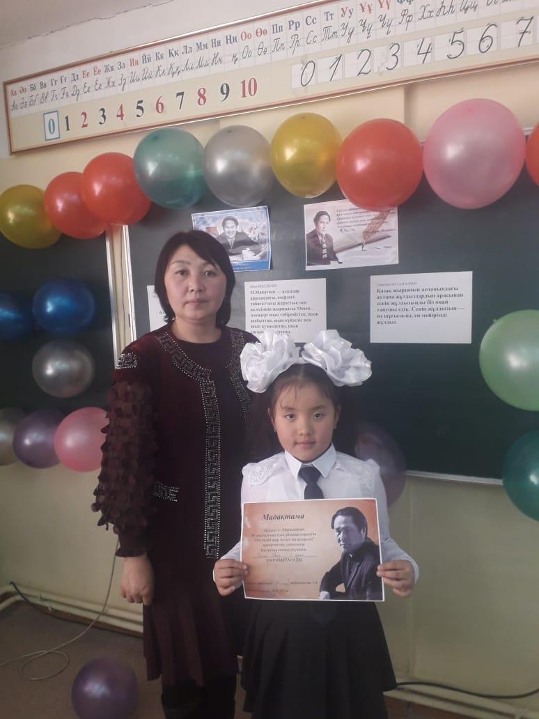 14 февраль 2022 0 1 2 3 4 5 Әлі талай жыр болып жазыларсың Алматы қаласы Алатау ауданы 26 жалпы білім беретін мектептің бастауыш сыныптар арасында М. Мақатаевтың туған күніне орай " Әлі талай жыр болып жазыларсың" тақырыбында өткен мәнерлеп оқудан 2-орын иегері Тілек АянаСынып жетекшісі: Өміралиева Кенже