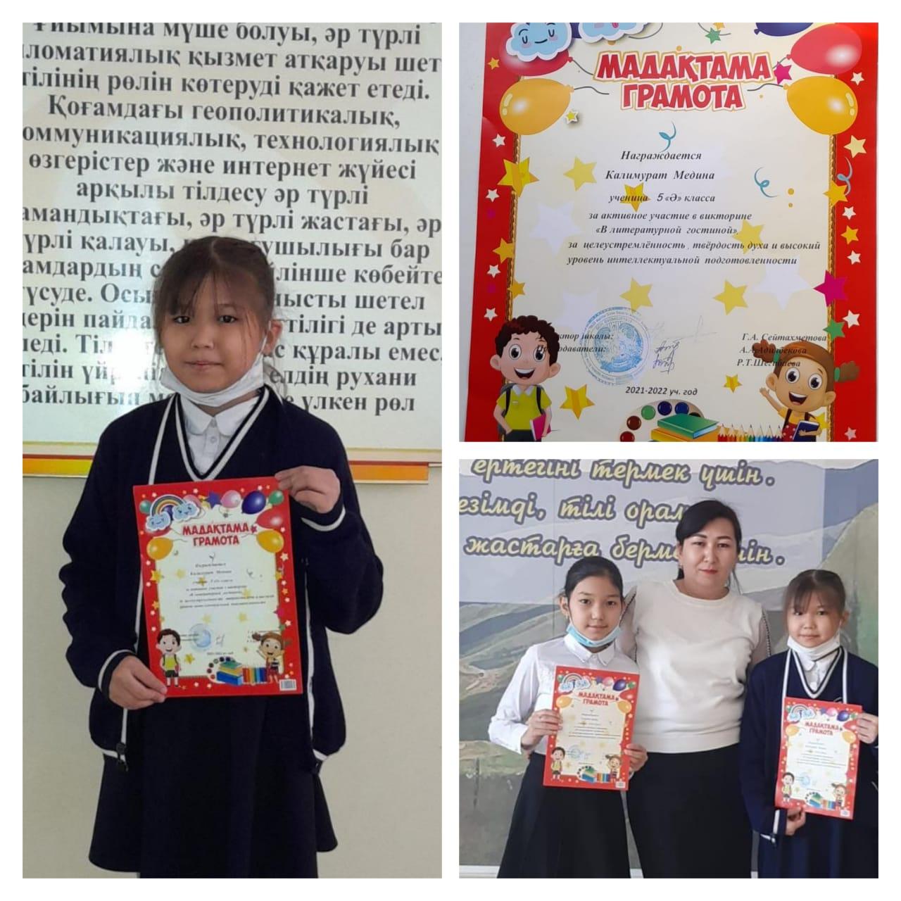 Алматы қаласы Алатау ауданы ✓26 жалпы білім беретін мектептің орыс тілі мен әдебиеті он күндігі аясында өткен іс шараларға белсенді қатысқандары үшін 5"Ә"сынып оқушылары Тәуірбай Адиля, Қалимұрат Медина мадақтамалармен марапатталды. Сынып жетекшісі: Сулейменова Сауле .