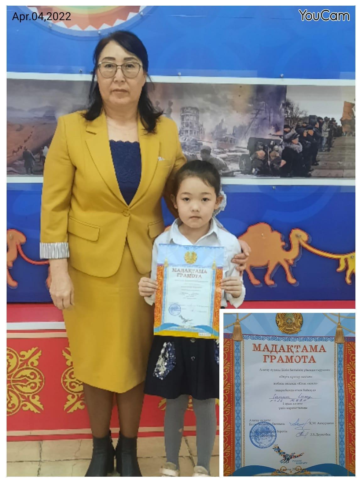 Алматы қаласы Алатау ауданы Білім бөлімінің ұйымдастыруымен "Оқуға құштар мектеп" жобасы аясында "Кітап оқиық" тақырыбында өткен байқауда 2"Г" сынып оқушысы Сатыш Інжу І-орынды иеленді.