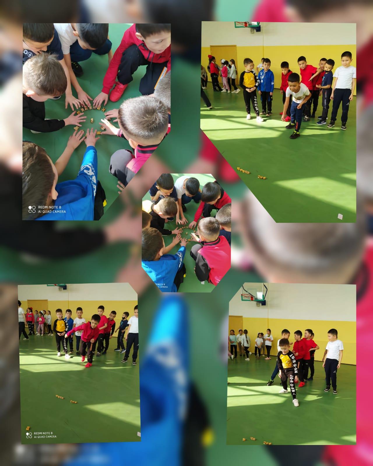 2"А" сынып оқушыларының дене шынықтыру сабағында қазақтың ұлттық ойындары "Ханталапай мен Асық ату" ойындарын жандандыру сәтінен көрініс.