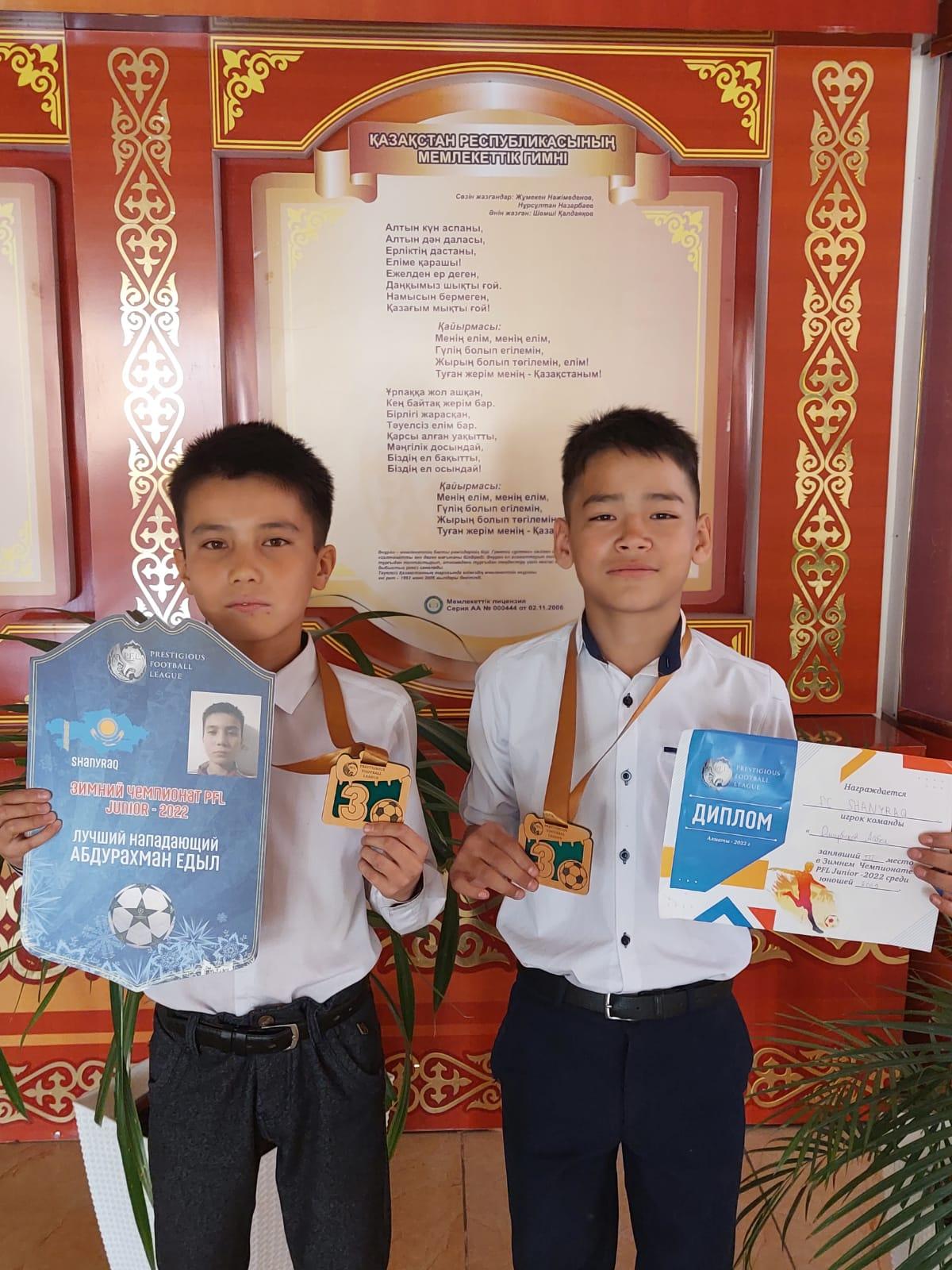 Алматы қаласы Алатау ауданы 26 жалпы білім беретін мектеп Junior-2022 қысқы чемпионат жасөспірімдер арасындағы футболдан мектебіміздің 7"Е" сынып білім алушылары:1.Омирбеков Айбол,2.Абдрахман Еділ lll орынды иелене отырып, нағыз қақпашы тақтасы, медаль және дипломдармен марапатталды. Құттықтаймыз!!! Сынып жетекшісі: Медетова П.С.