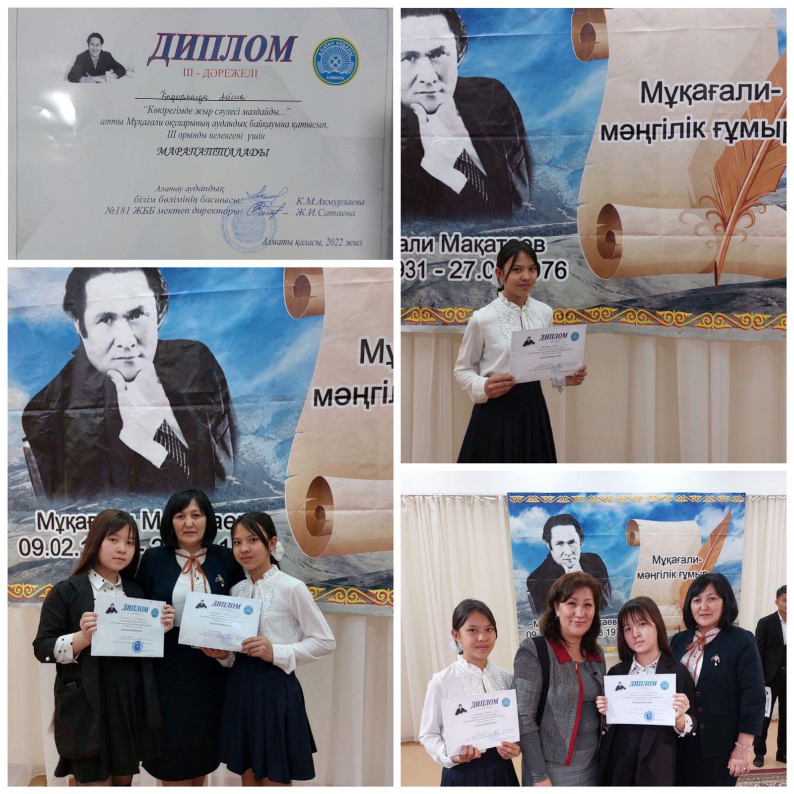 Алматы қаласы Алатау ауданы N26 жалпы білім беретін мектептің 7"Е" сынып білім алушысы Қыдырмолда Айша Аудандық білім бөлімінің ұйымдастыруымен өткізілген "Көкірегімдегі жыр сәулесі маздайды..." атты (Өз шығармашылығы бойынша) Мұқағали оқуларының аудандық байқауына қатысып, lll орын иеленгені үшін марапатталды.