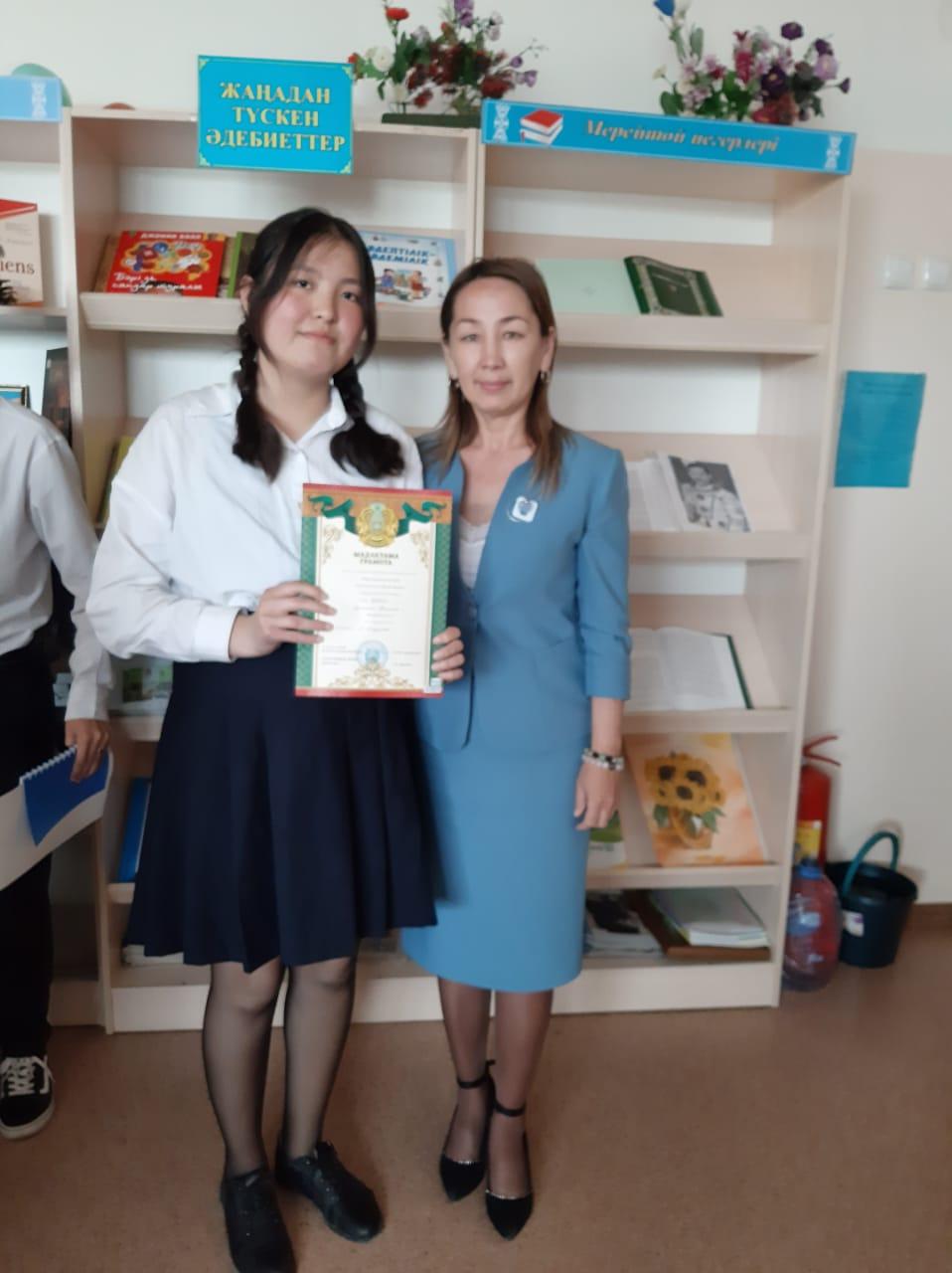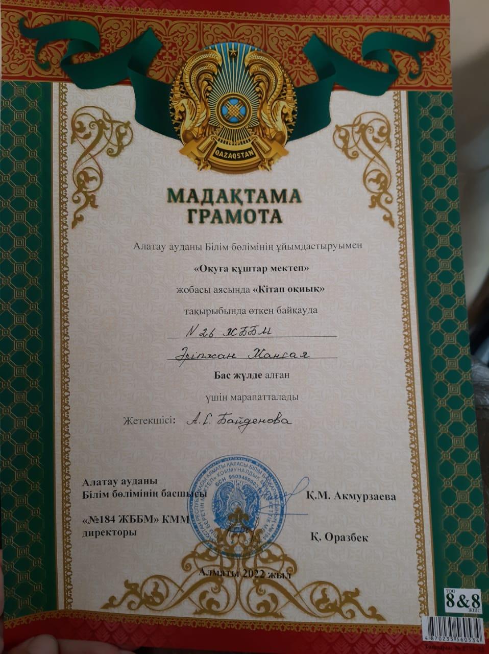 "Оқуға құштар мектеп " жобасы аясында "Кітап оқиық " тақырыбында өткен байқауда №26 ЖББмектептің 9"Д" сынып білім алушысы Әріпжан Жансая Ертайқызы "БАС ЖҮЛДЕ " алғаны үшін марапатталды.