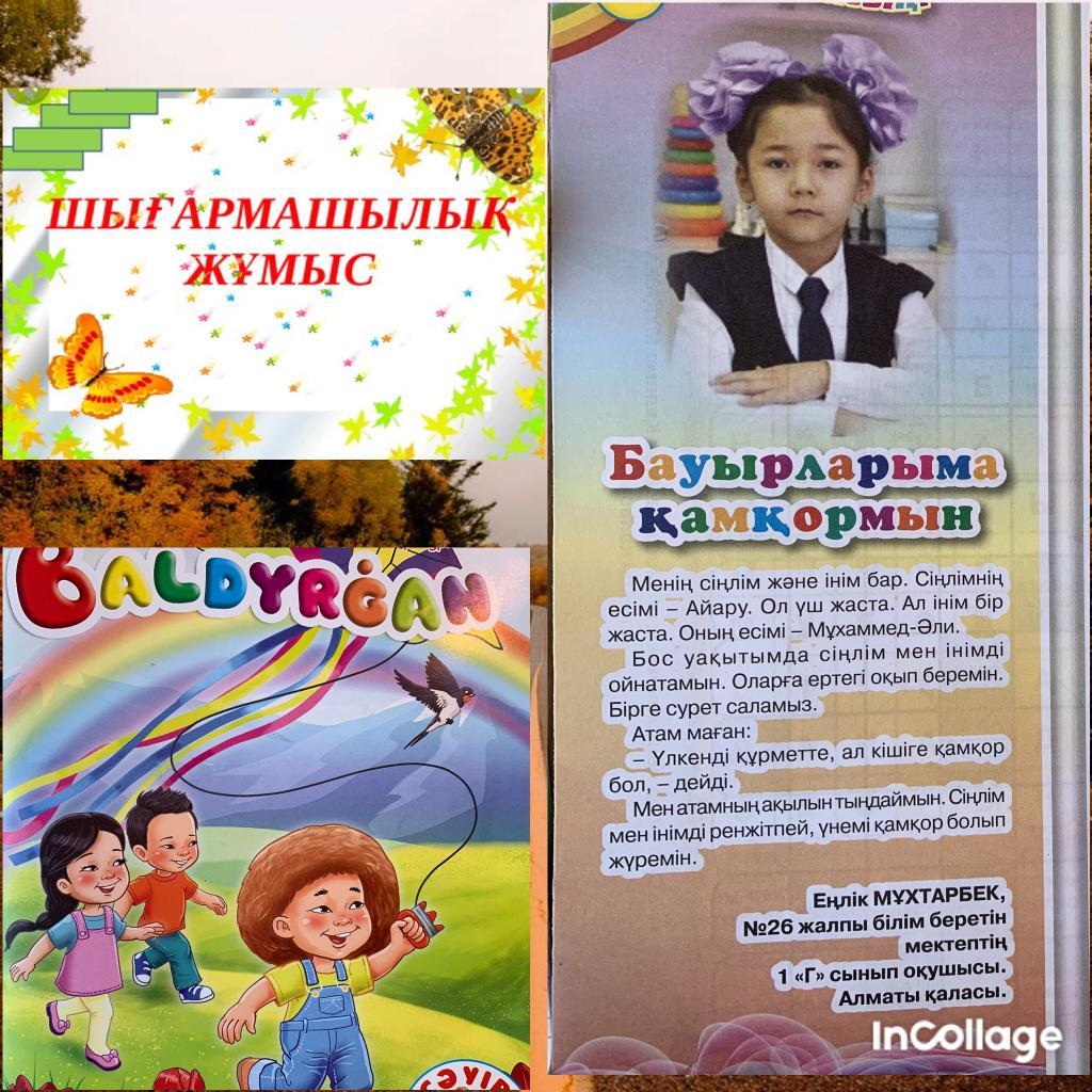 Алматы қаласы Алатау ауданы N 26 жалпы білім беретін мектептің 1”Г” сынып оқушысы Мұхтарбек Еңліктің “Балдырған”журналына “Бауырларыма қамқормын “атты шығармашылық жұмысы жарияланды.