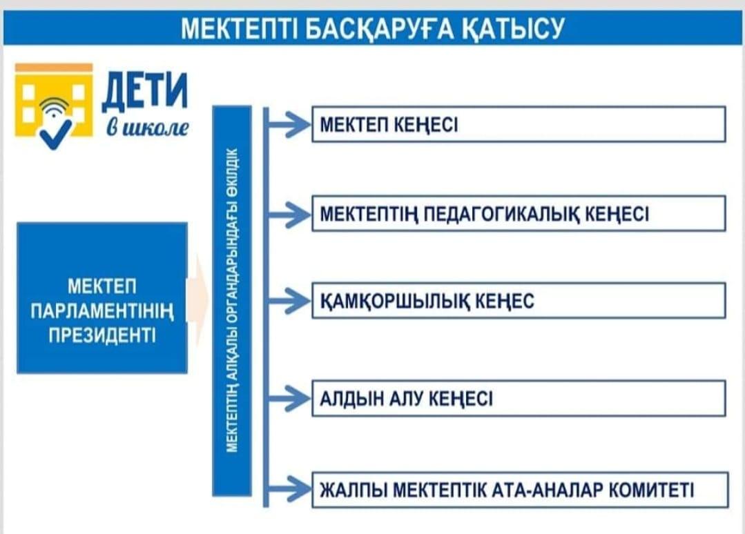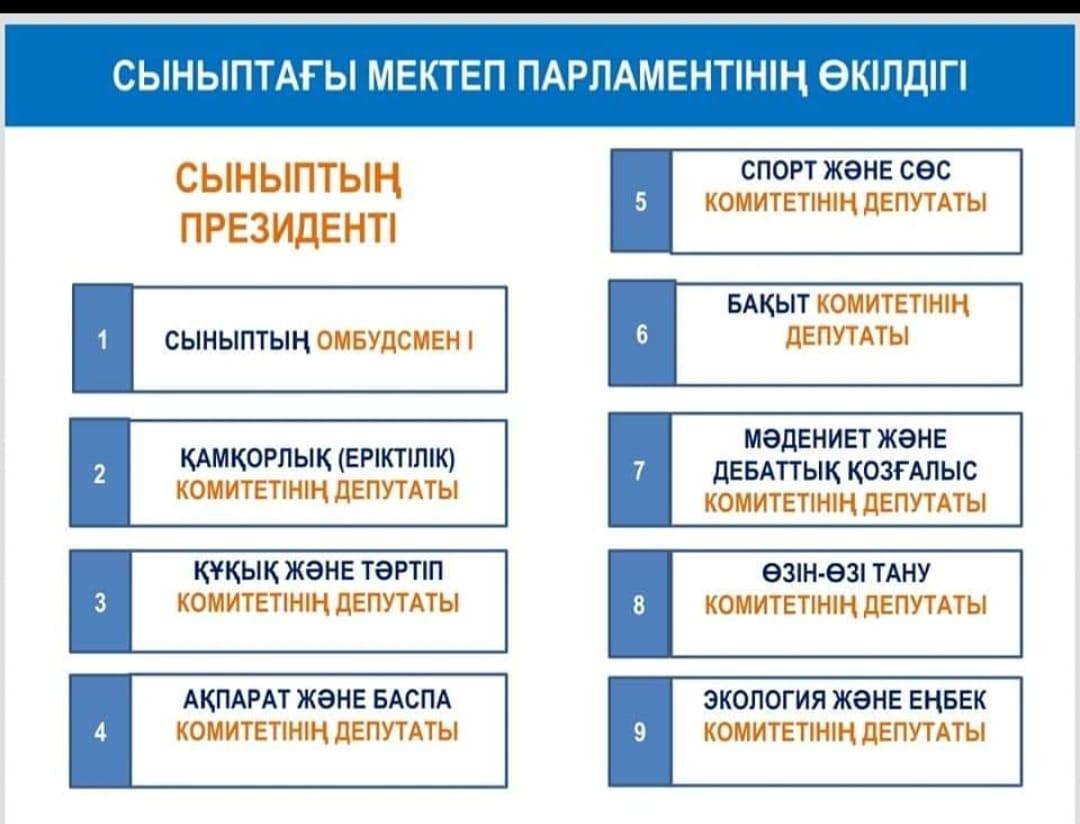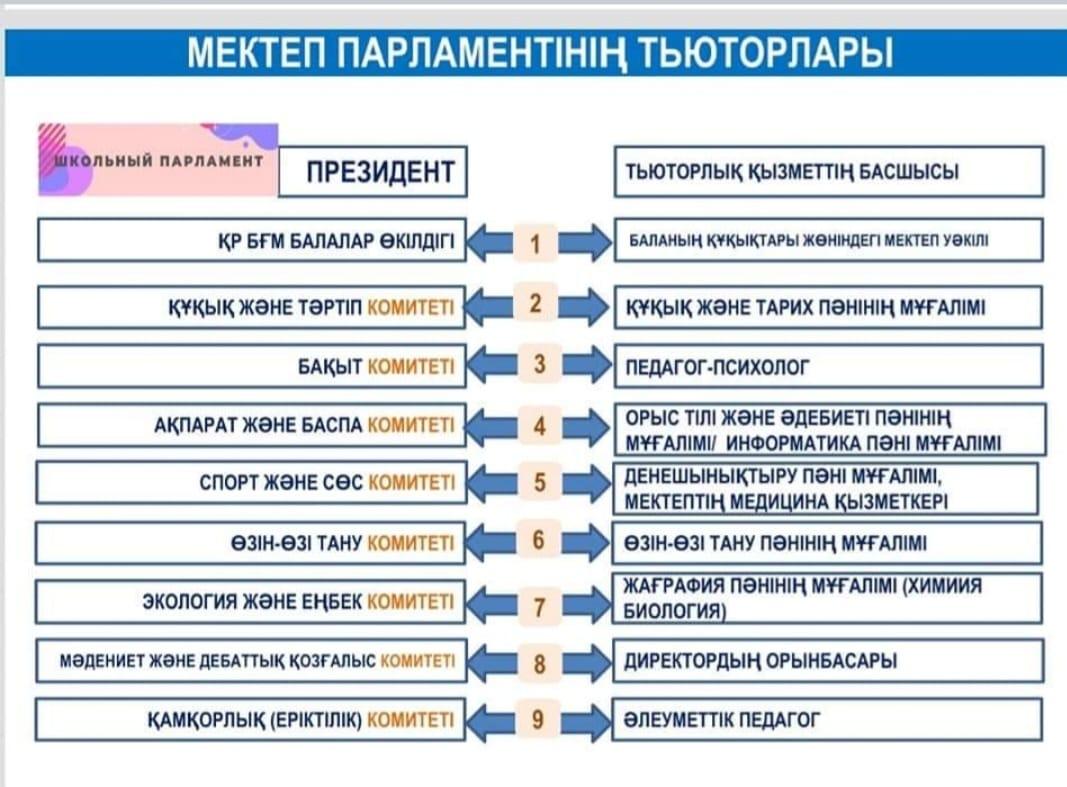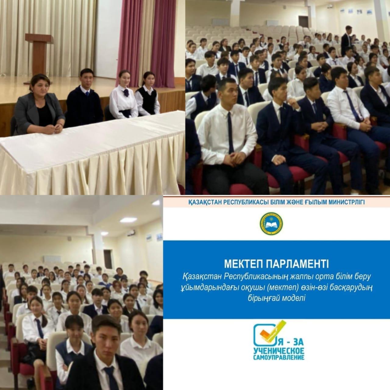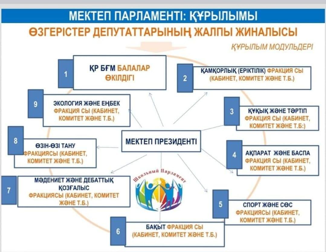 Білім алушылардың бойында азаматтық белсенділік, әлеуметтік құзыреттілік, азаматтық жауапкершілік дағдыларын дамыту, әлеуметтік шығармашылыққа қабілетті, өзінің жеке басын, қоғам мен мемлекетті жетілдіру мүддесінде әрекет ете алатын жоғары мәдениетті, гуманистік бағыттағы азаматты тәрбиелеу мақсатында 2022-22023 оқу жылының Мектеп Парламенті 8 фракция бойынша жұмыс жоспары құрылды. Оқушылар мен педагогтар бірлесіп, ынтымақтасып жұмыс жасау үшін тьюторлық қызметтің басшылары тағайындалды. Патриотизм «Жас Ұлан» ұйымы, Қайырымдылық «Жомарт жүрек», «Адал ұрпақ» еріктілер клубы, Құқық және тәртіп, Ақпарат фракциясы «Жаңалық жаршысы», Спорт және салауатты өмір салты фракциясы, Өзін-өзі тану және бақыт фракциясы, Дебат қозғалысының фракциясы, Мәдениет және өнер және Экология және еңбек фракциясы. Мектептегі өмірдің қызықты әрі әсерлі өтуі үшін мектеп парламенті белсенді жұмыс жасауын жаңашылдықпен ұйымдастыруда. Жоспар бойынша өткізілген іс-шаралар барлық ақпараттар фракциялар парақшалары мен мектеп сайтына салынып отырады.
