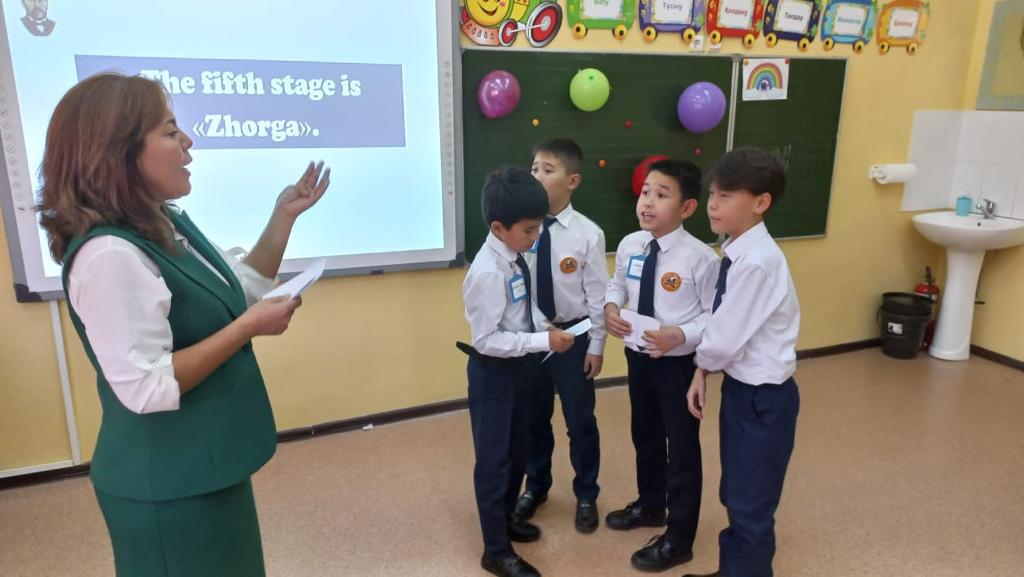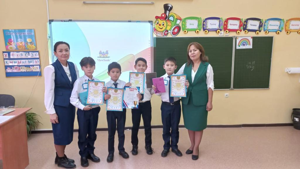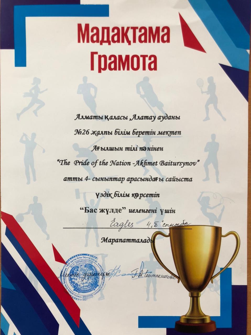 Ағылшын тілі пәнінен “ The Pride of the Nation-Akhmet Baitursynov” атты 4- сыныптар арасындағы сайыста үздік білім көрсетіп “ Бас жүлде” иеленгені үшін 4 “ Б” сыныбының “Eagles “командасы марапатталды Сынып жетекшісі: Адилова Айнагуль Маратовна