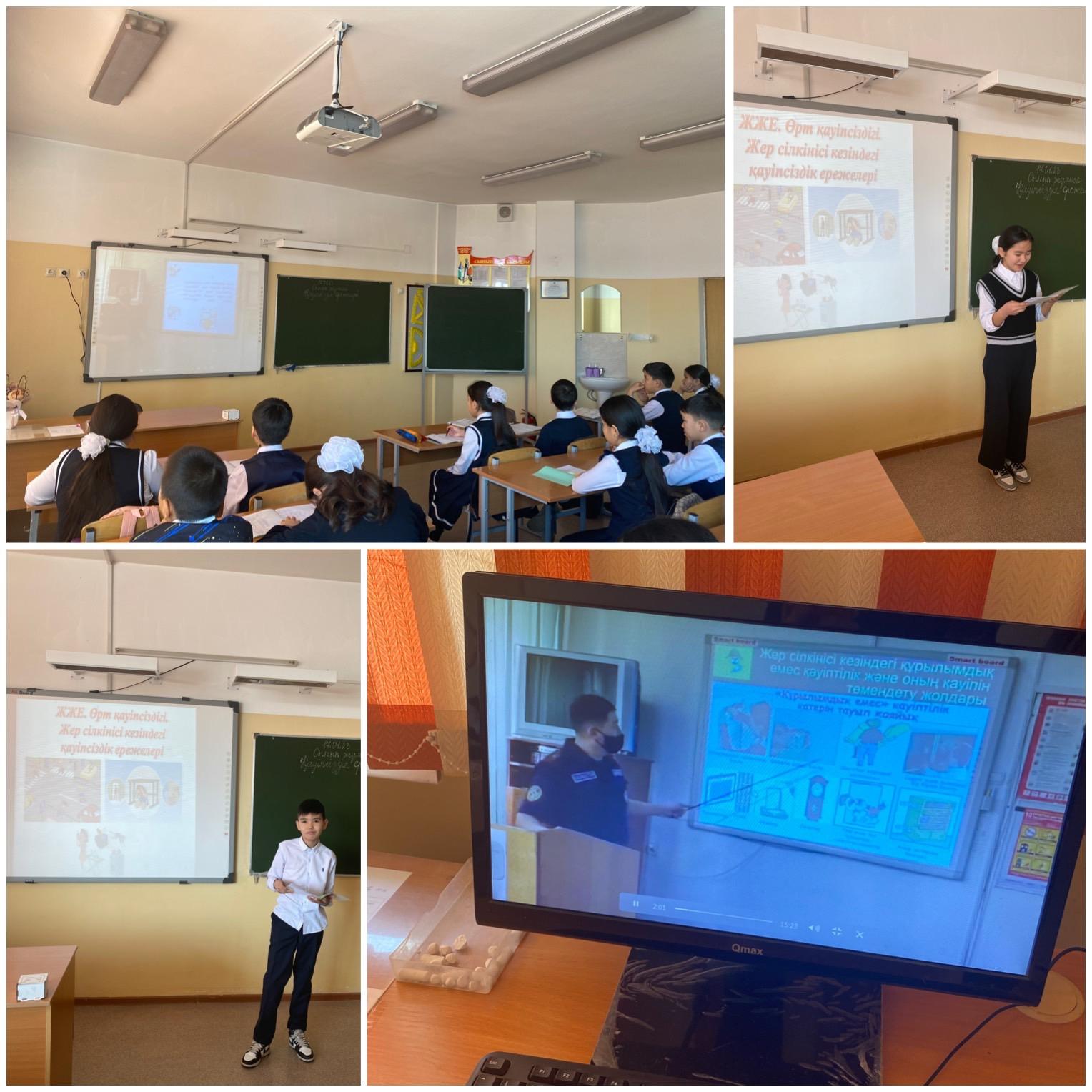 Алматы қаласы, Алатау ауданы №26 жалпы білім беретін мектептің 5 “В” сыныбы. “Жер сілкінісі алдында, кезінде, кейін халықтың іс-әрекеті” тақырыбында интербелсенді тақтада ақпарат берілді. Сынып жетекшісі: Мәлік Назерке Болатқызы