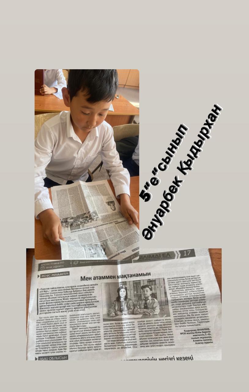 03 июнь 2023 0 1 2 3 4 5 “Мен атаммен мақтанамын” Алматы қаласыАлатау ауданы26ЖББ Мектептің 5”Е”Сынып білім алушысыӘнуарбек Қыдырханның “Білімді ел”газетіне “Мен атаммен мақтанамын”атты мақаласы жарық көрді.Қаламың ұштала берсін !Жарайсың Қыдырхан!Сынып жетекшісі:Алипбаева .С.Д