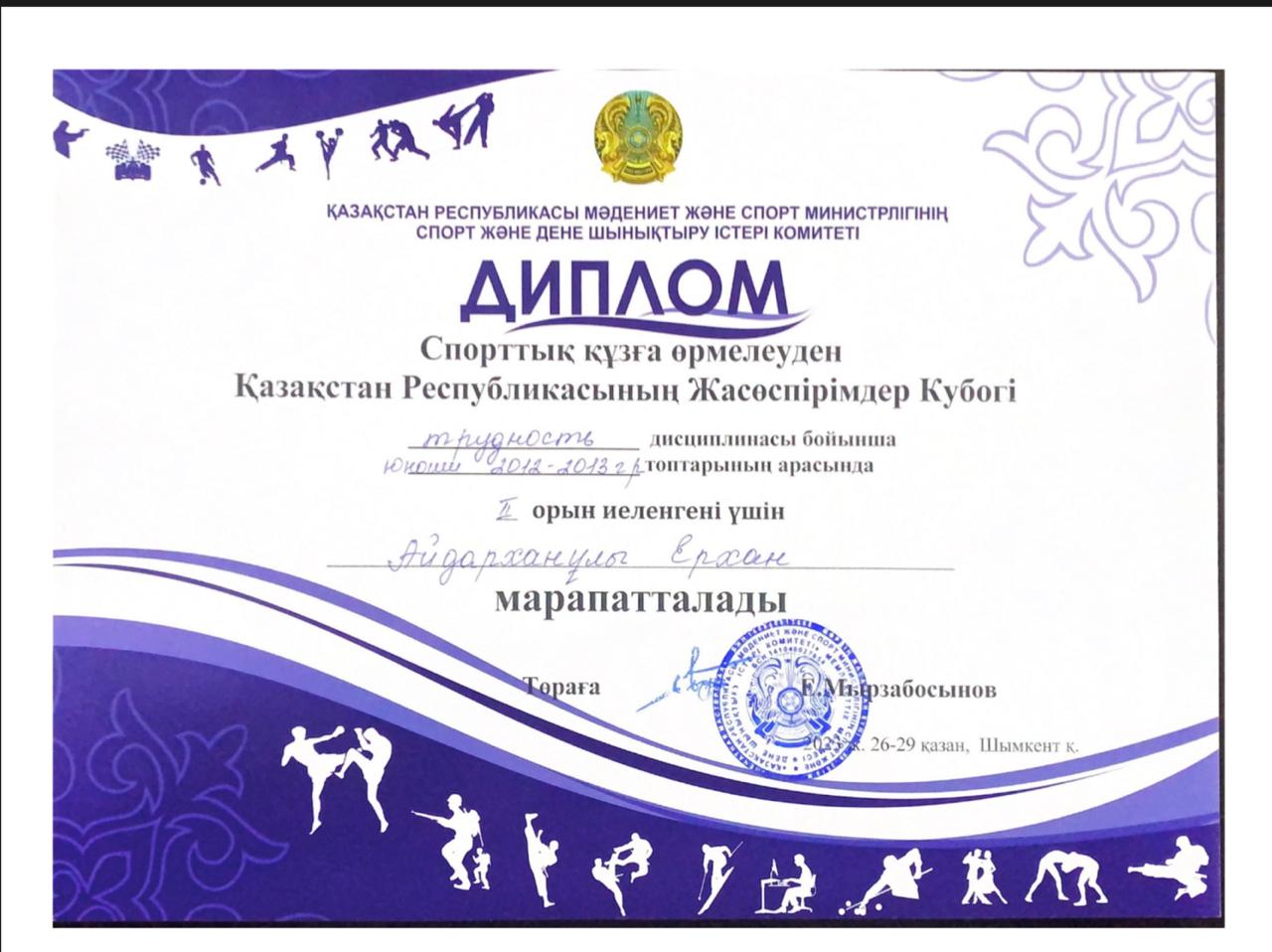 31 октябрь 2023 0 1 2 3 4 5 Алматы қаласы Алатау ауданы 26 ЖББ Мектептің 6”Е” сынып оқушысы Айдарханұлы Ерхан Спорттық құзға өрмелеуден Қазақстан Республикасының Жасөспірімдер Кубогі 2012-2013 топтар арасында 2-орынмен марапатталды .