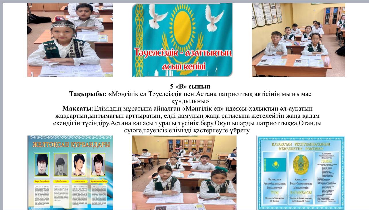 06 декабрь 2024 0 1 2 3 4 5 Алматы қаласы Алатау ауданы №26 жалпы білім беретін мектептің 5”В” сыныбымен "Мәңгілік ел Тәуелсіздік пен Астана патриоттық актісінің мызғымас құндылығы" тақырыбында сынып сағатын өтті.