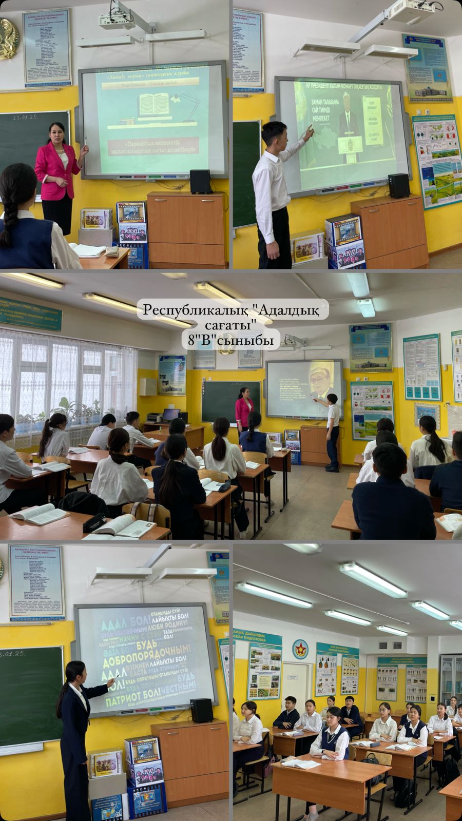 Алматы қаласы Алатау ауданы №26 ЖББМ 2024 жыл 27 ақпан күні 9 «Д» сынып білім алушыларымен «Өмірдің әртүрлі салаларындағы адалдық» тақырыбында сынып сағаты өтті. Мақсаты: Адамдардың бір-біріне деген және Отан мен тілге деген адалдығын айту.