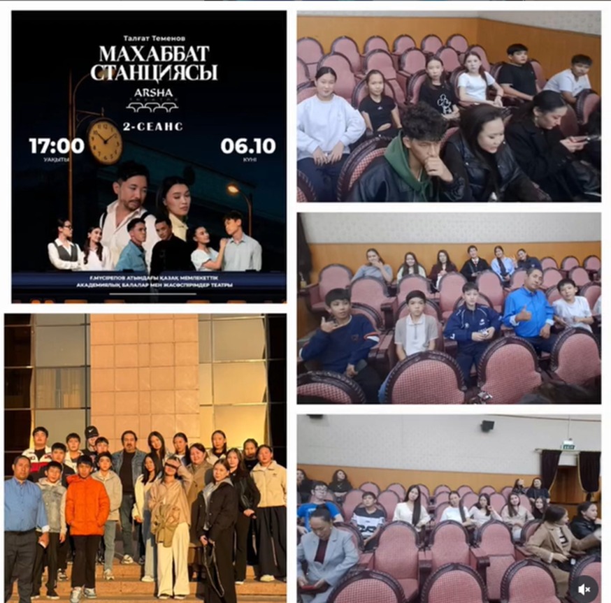 Ғабит Мүсірепов атындағы театрға барып, "Махаббат станциясы" қойылымын көріп қайтты. Мақсаты: Театр көру арқылы шығармашылық және парасаттылық қабілеттерін жан-жақты дамыту. Театр өнерін қастерлей білуге баулу. Адамгершілікке, ұйымшылдыққа тәрбиелеу.