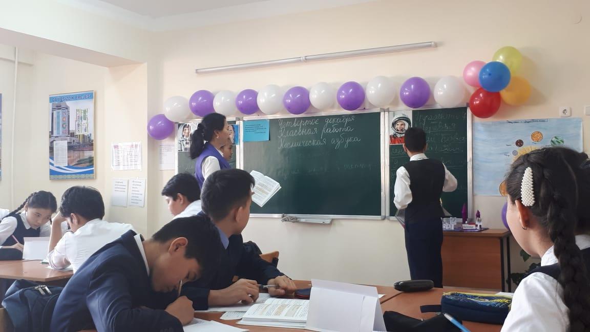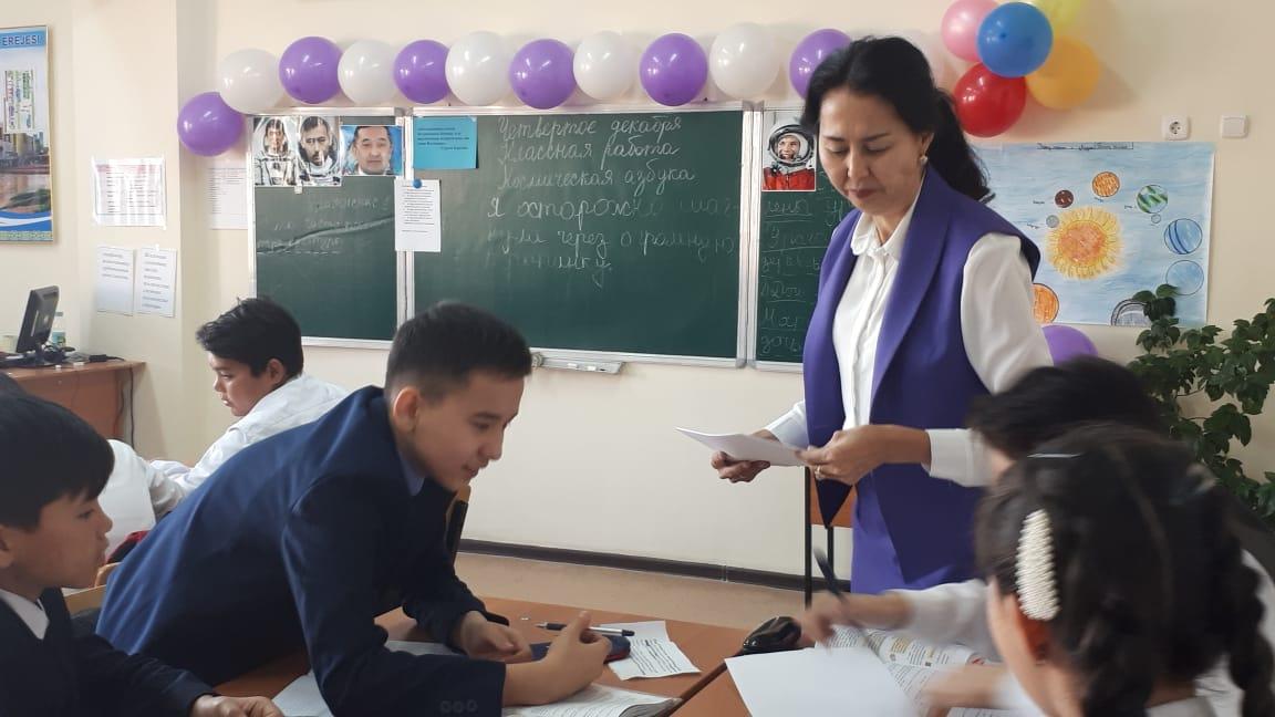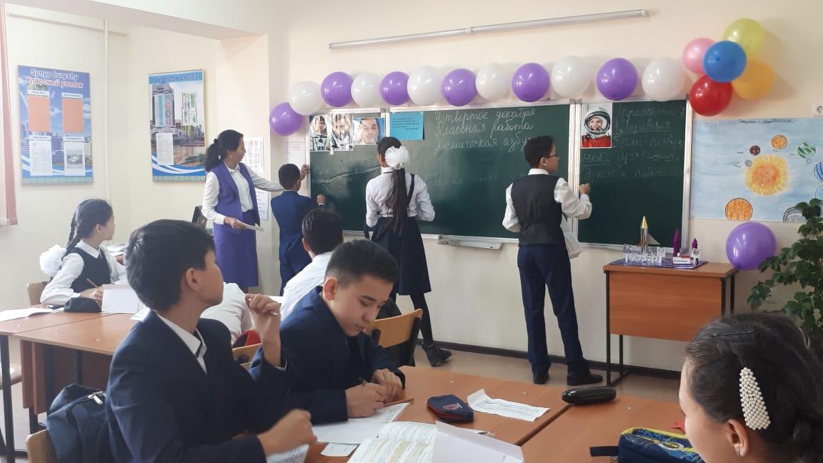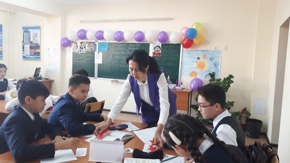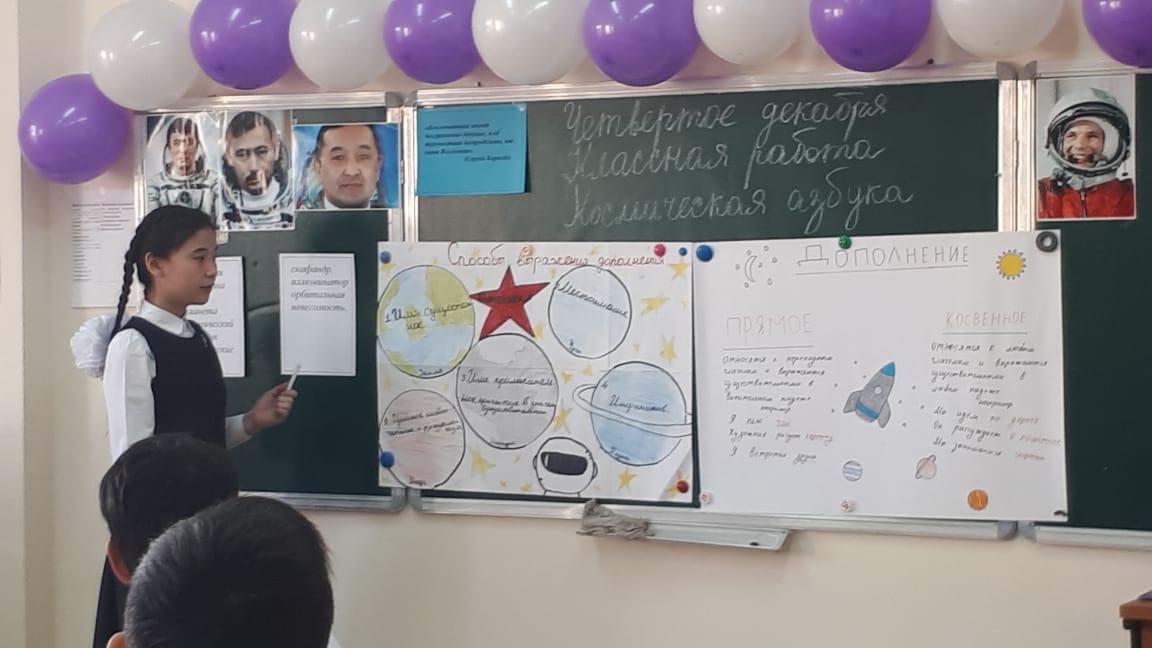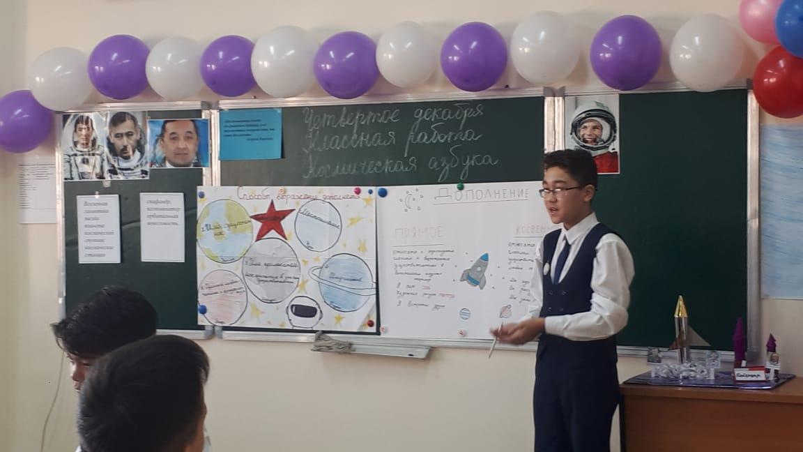 | Начало урока | I. Организационный момент. Создание коллаборативной среды. Для создания психологической атмосферы проводит игру «Солнечный зайчик». Учитель приветствует учащихся на трех языках: казахском, русском, английском. Деление класса на группы: 1-я группа: "Звездочка" 2-я группа: "Солнышко" 3-я группа: "Луна" Эпиграф урока «Космонавтика имеет безграничное будущее, и её перспективы беспредельны, как сама Вселенная». (Сергей Королёв) II. Актуализация знаний. На доске записаны ключевые слова: Вселенная, галактика, звезда, планета, космический спутник, космические станции, скафандр, иллюминатор, орбитальная, невесомость.