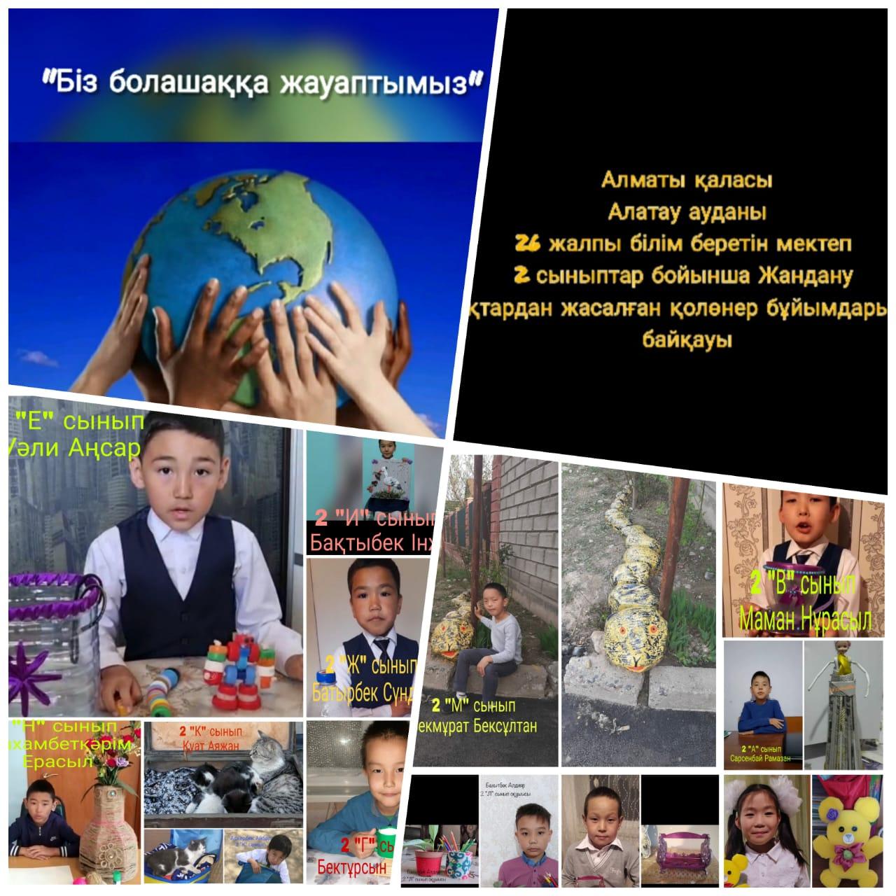 №26 жалпы білім беретін мектепте "Біз болашаққа жауаптымыз" атты апталық аясында 28.04.3021ж күні Жандану қалдықтардан жасалған қолөнер бұйымдарының байқауы 1,11-сыныптар арасында өткізілді.Мақсаты: оқушыларды жарамсыз,қалдық заттарынан әртүрлі іске жарамды бұйымдар жасауға үйрету. Қатысқан оқушы саны-40