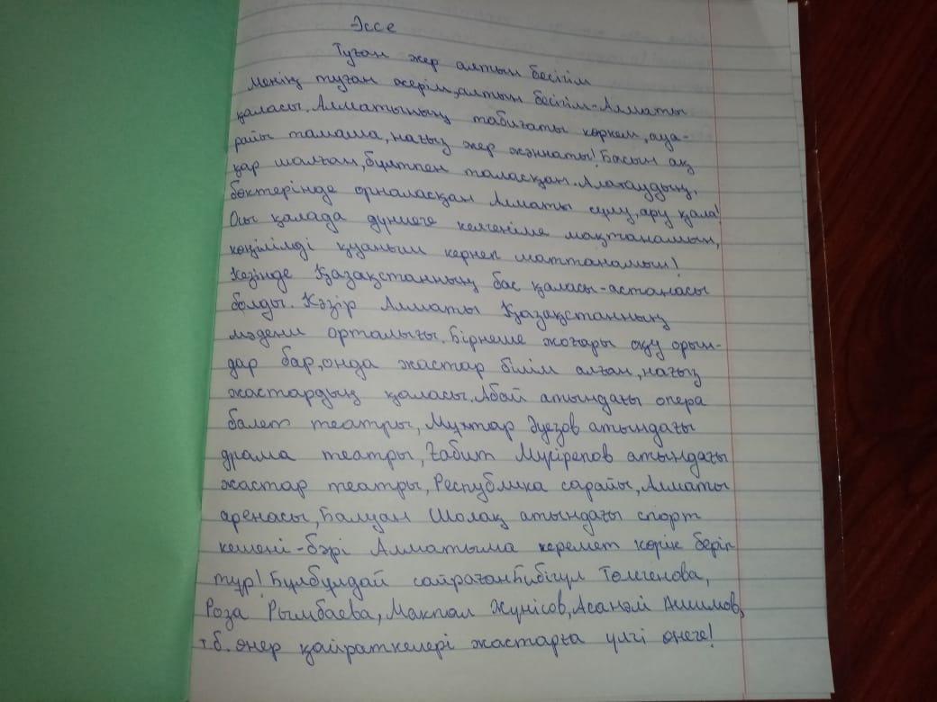 Алматы қаласы Алатау ауданы №26 жалпы білім беретін мектепте Оқушыларды Отанын сүюге, туған жерінің тарихын білуге, туған жерін қастерлей білуге тәрбиелеу мақсатында «Жас Ұлан» ББЖ ұйымының жоспарына сәйкес «Зерде» бағыты бойынша 8-сынып оқушылары арасында «Туған жер-Алтын бесігім» тақырыбында эссе жазу ұйымдастырылды. Қатысқан оқушылар саны-10