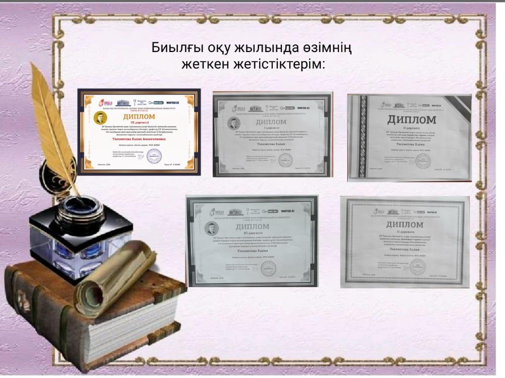 Серғазы А. «Тұран» олимпиада номинация 2018ж. | Сатылғанова Т, Оралбекова А. Qaztest.kz Бекмаханов Е. атындағы ІІ Республикалық «Қазақстан тарихы» олимпиадасы ІІІ дәрежелі диплом 2020ж |