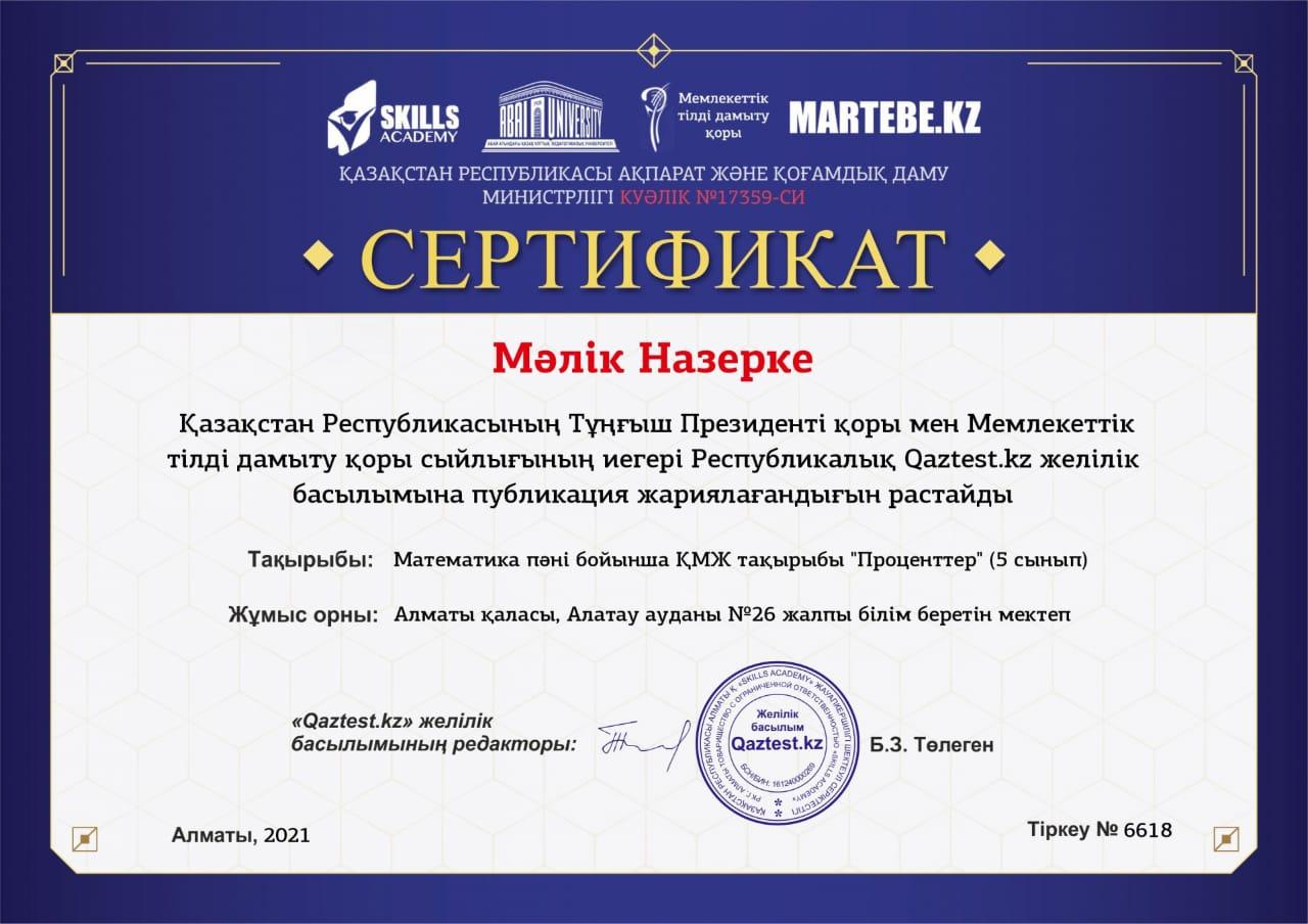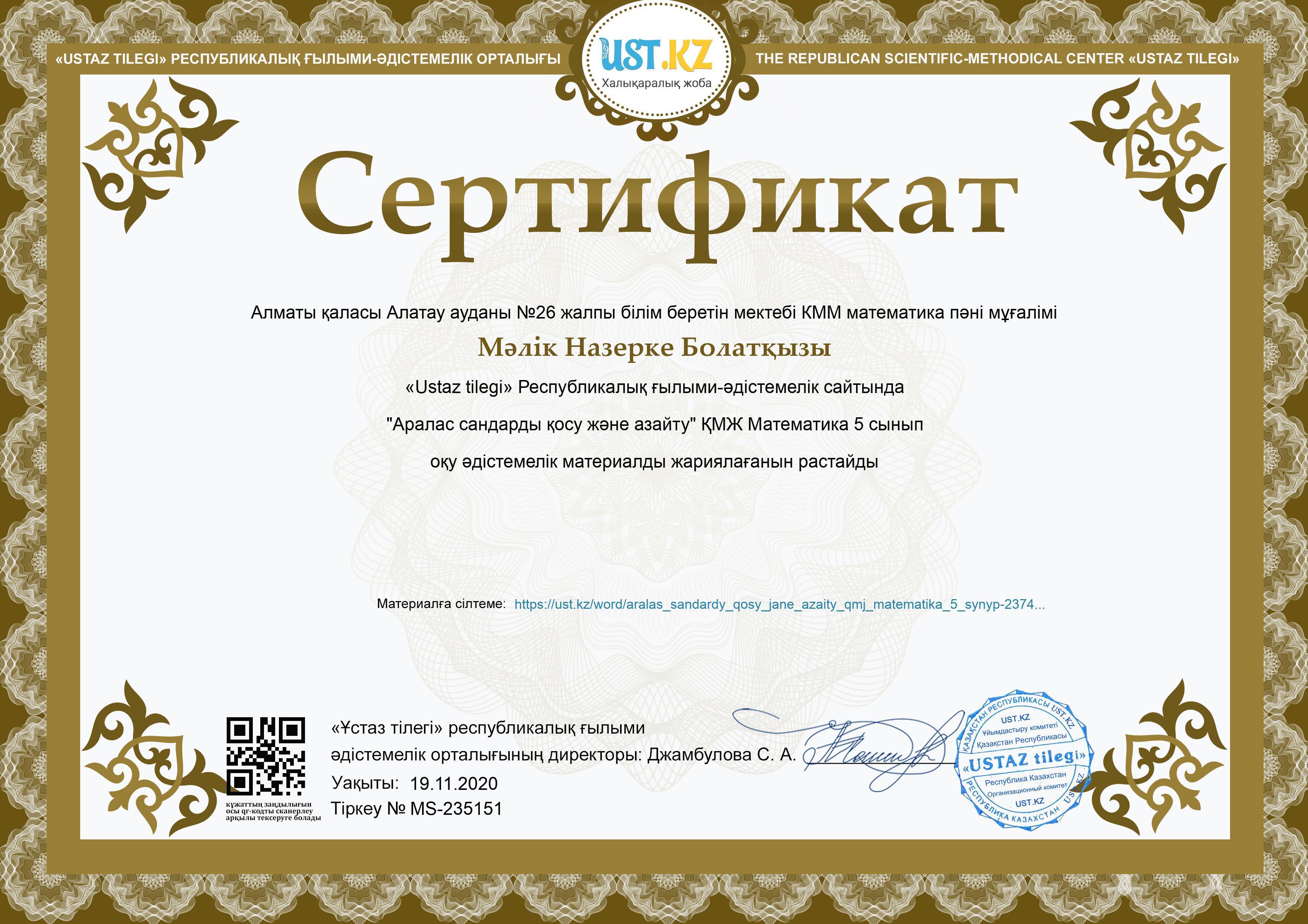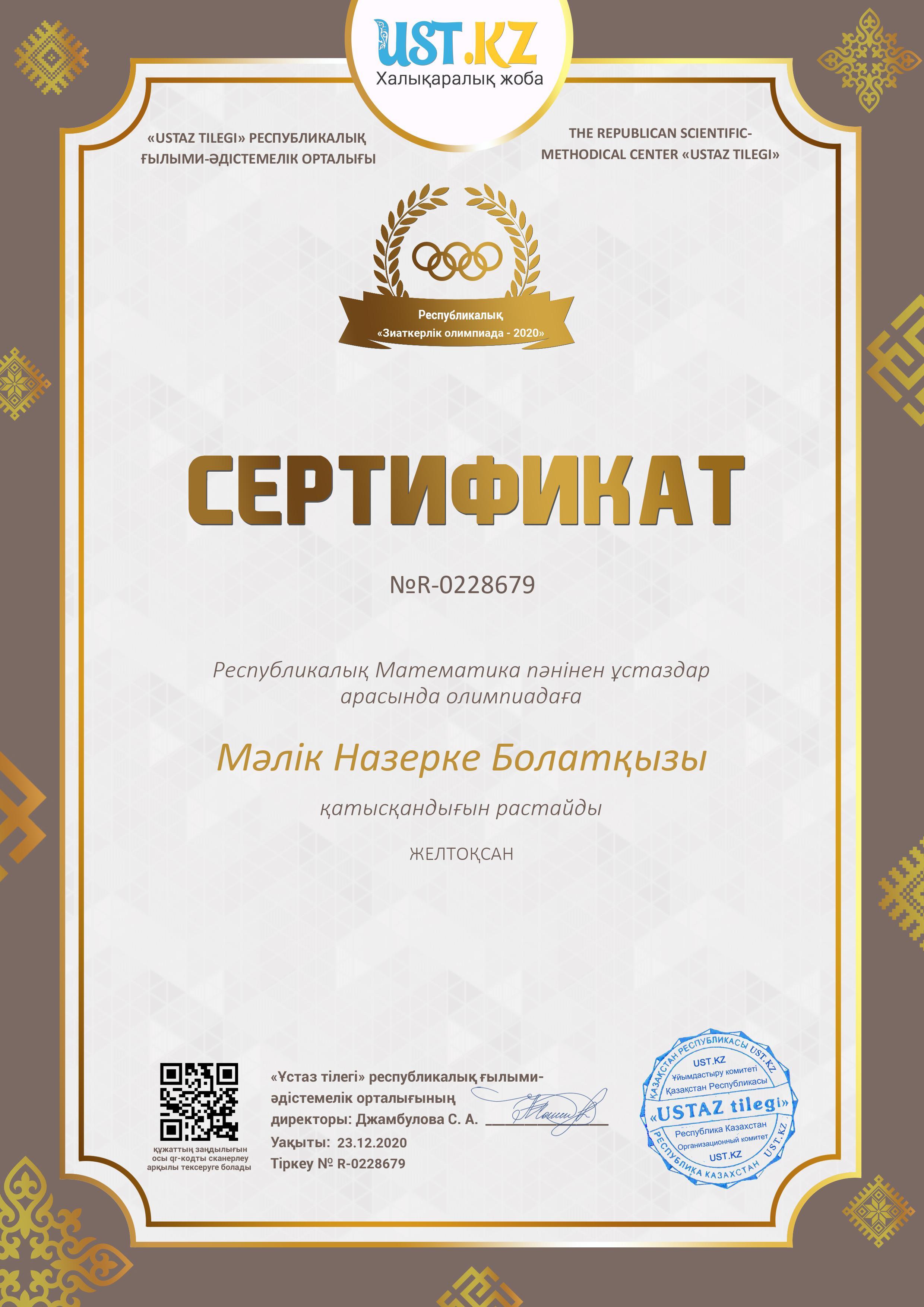 - USTAZ TILEGI» Республикалық ғылыми-әдістемелік орталығы, Республикалық олимпиадасы, математика пәні бойынша (сертификат, №R-0228679, 2020 ж)