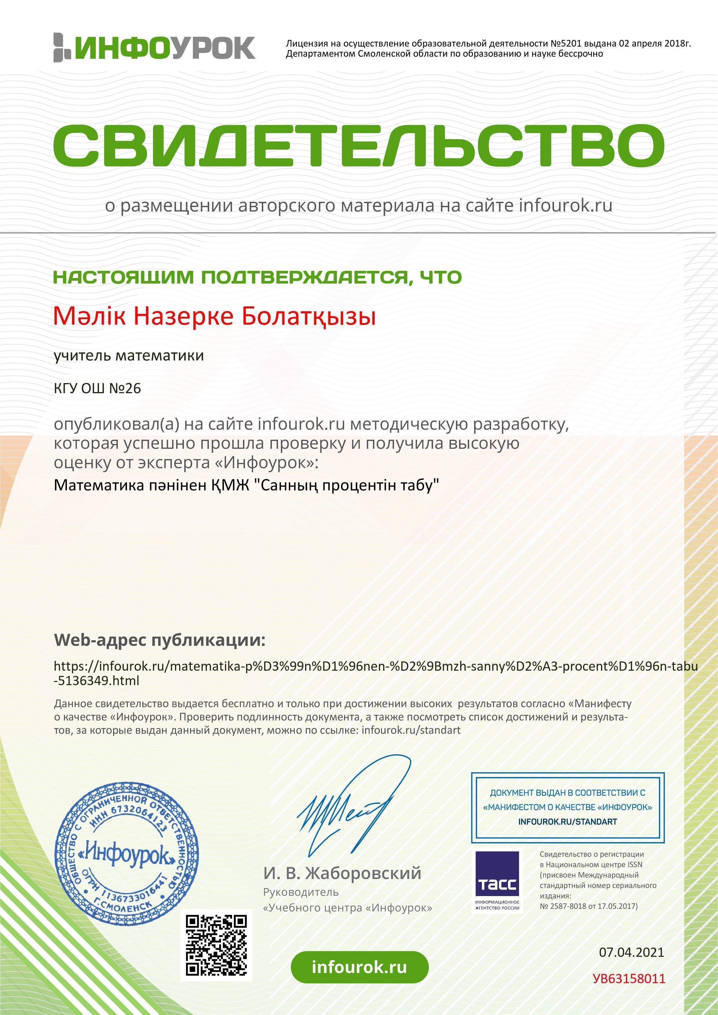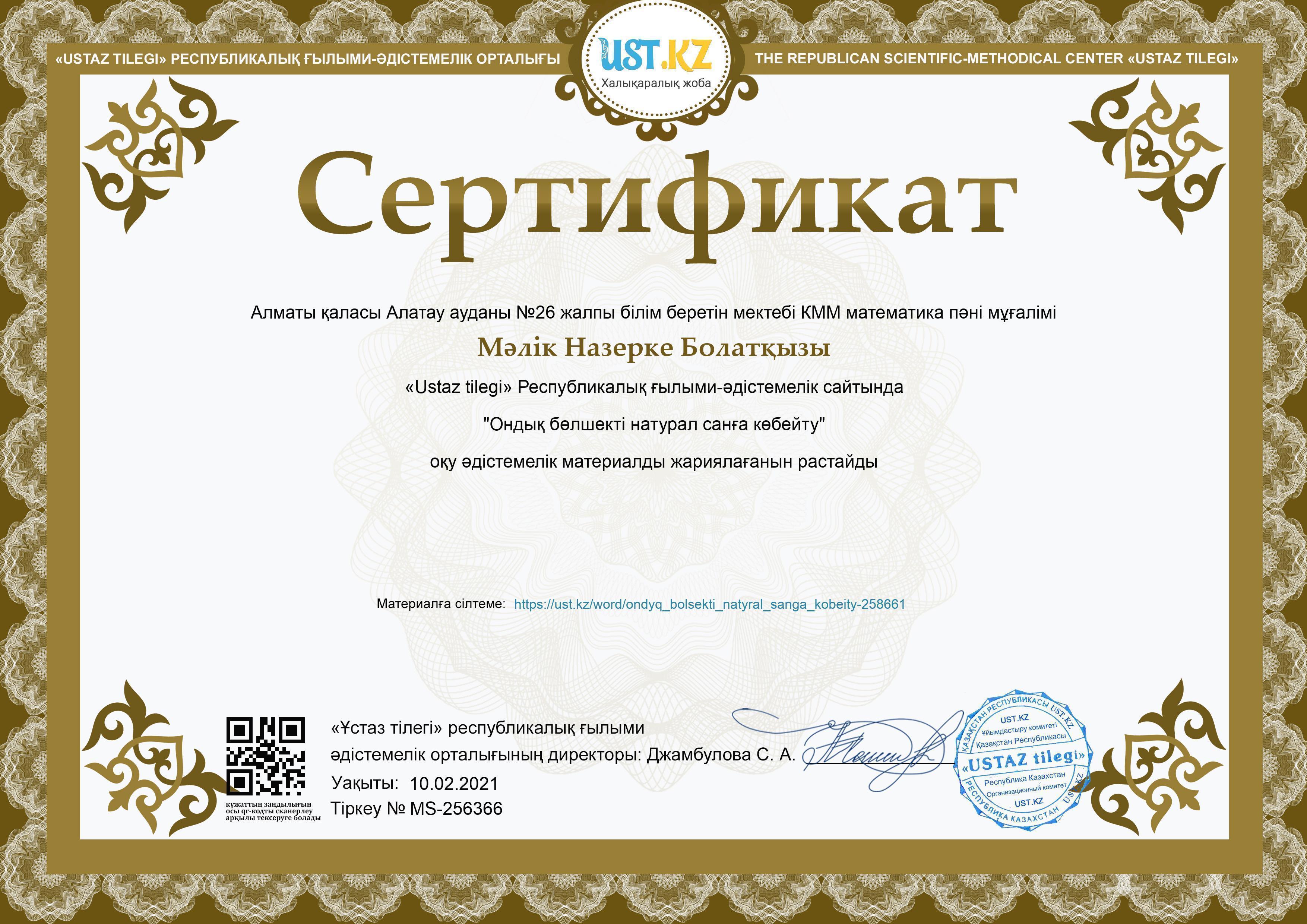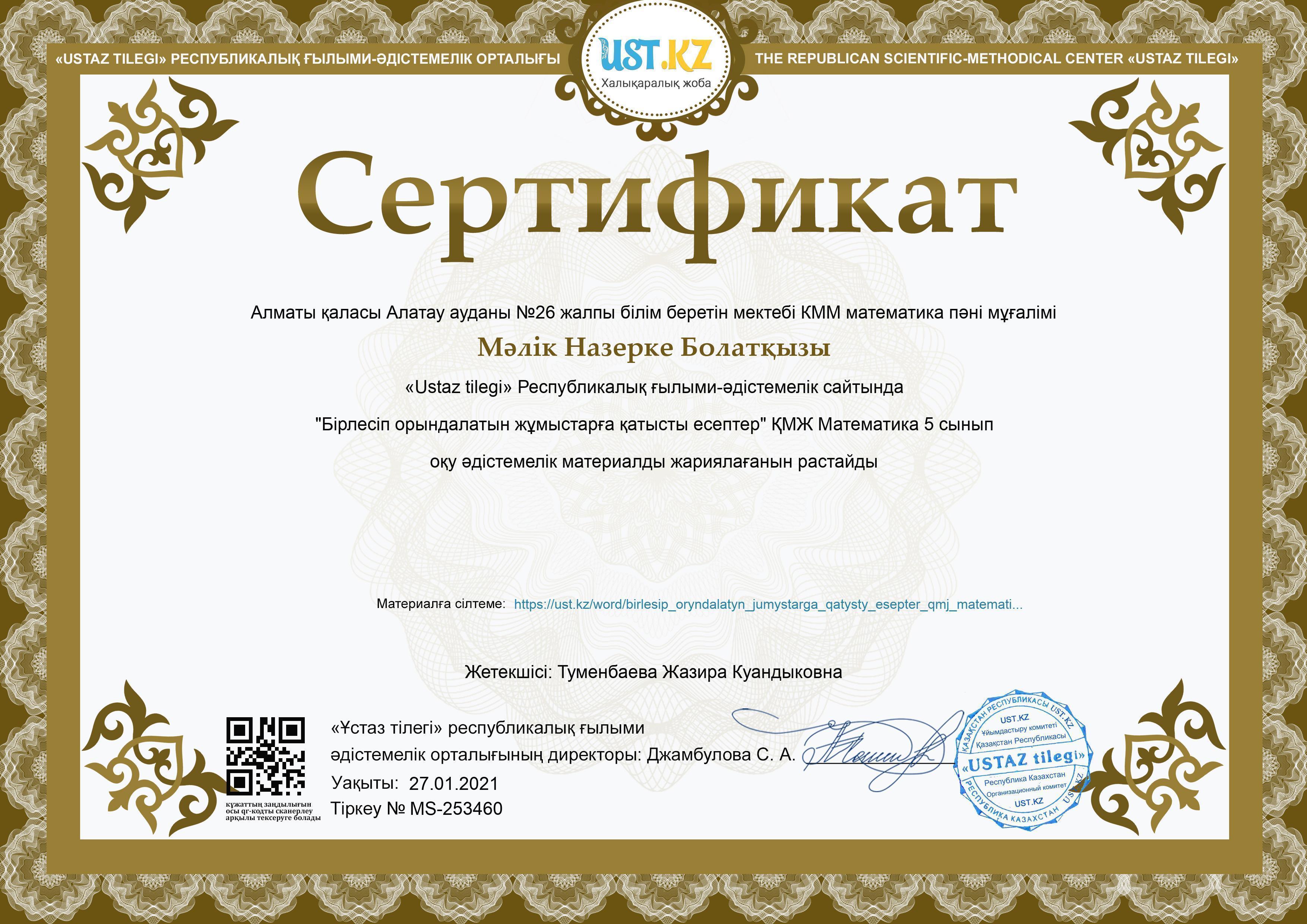 - USTAZ TILEGI» Республикалық ғылыми-әдістемелік орталығы, Республикалық олимпиадасы, математика пәні бойынша (сертификат, №R-0228679, 2020 ж)
