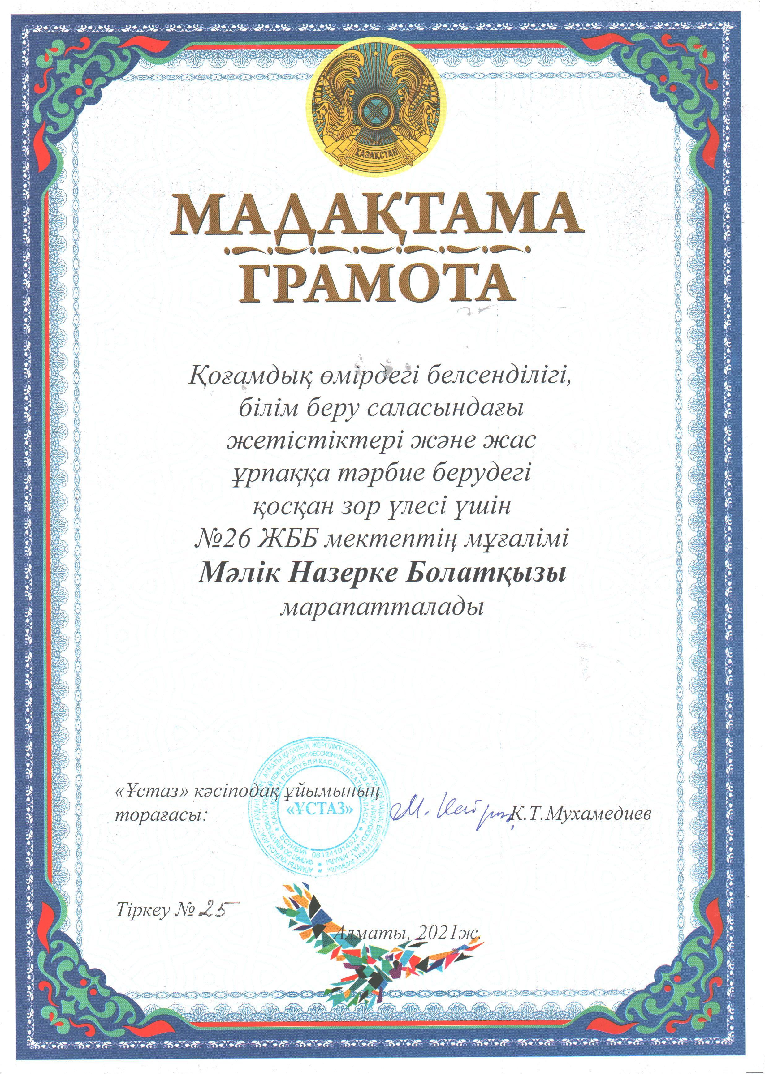 - 2020 жылы «Ұстаз» кәсіподақ ұйымының төрағасынан мадақтама грамотасын алдым.