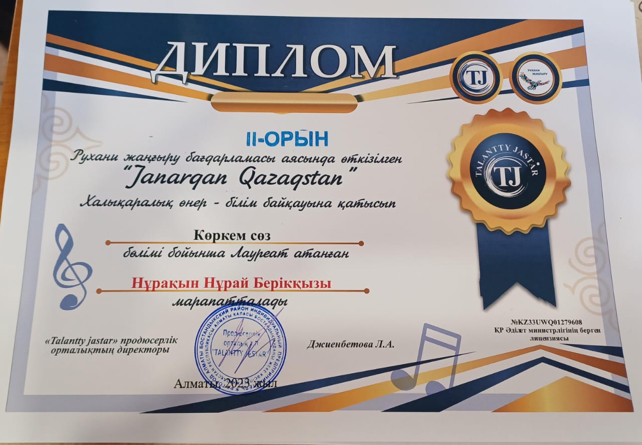 28 ноябрь 2023 0 1 2 3 4 5 Рухани жаңғыру бағдарламасы аясында өткізілген Халықаралық өнер-білім байқауының Көркем сөз бөлімі бойынша Лауреат, 2 -ші дәрежелі дипломмен 1 "К" сынып оқушысы Нұрақын Нұрай Берікқызы марапатталды.