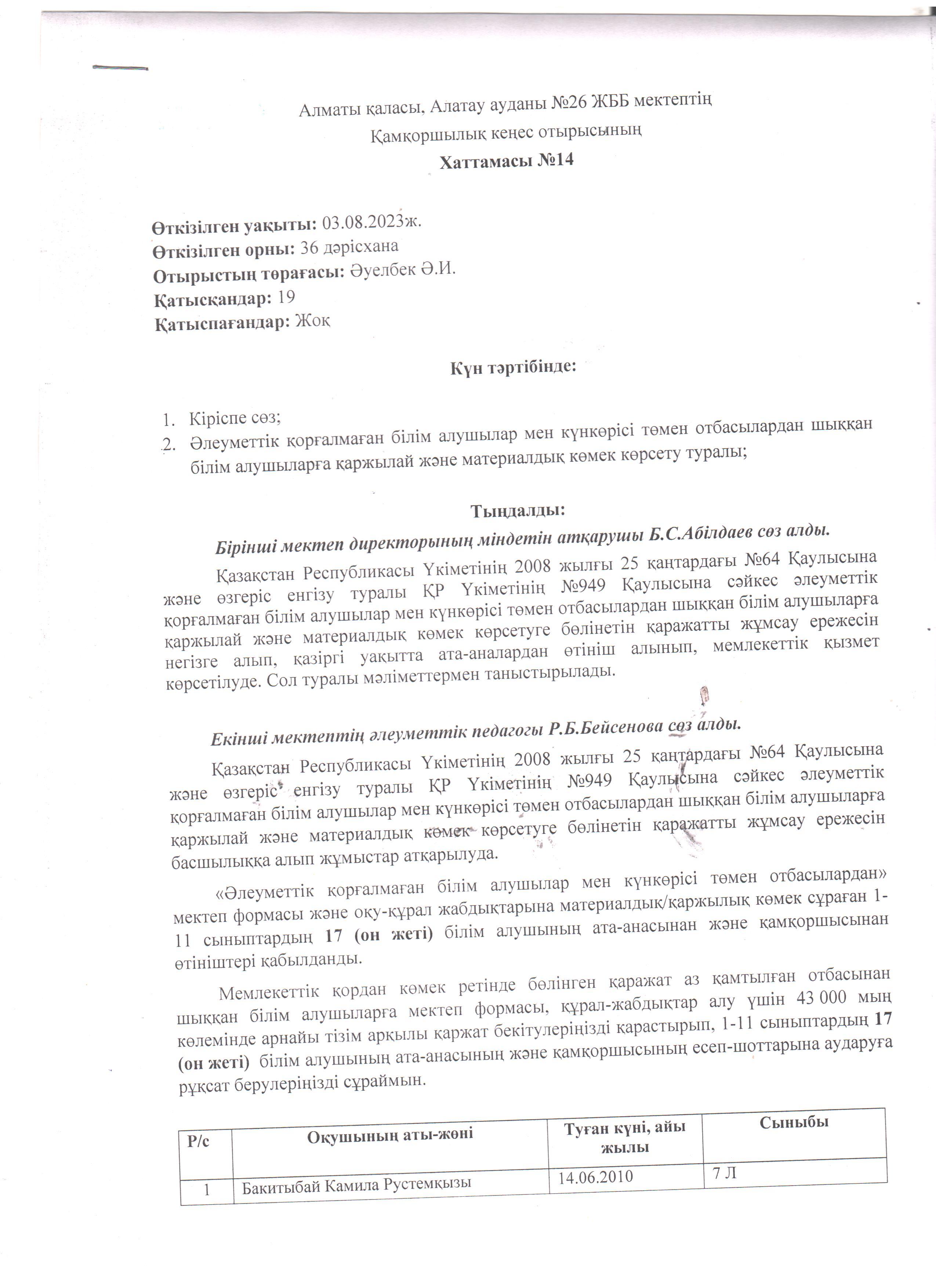 Қамқоршылық кеңес отырысының хаттамасы №14