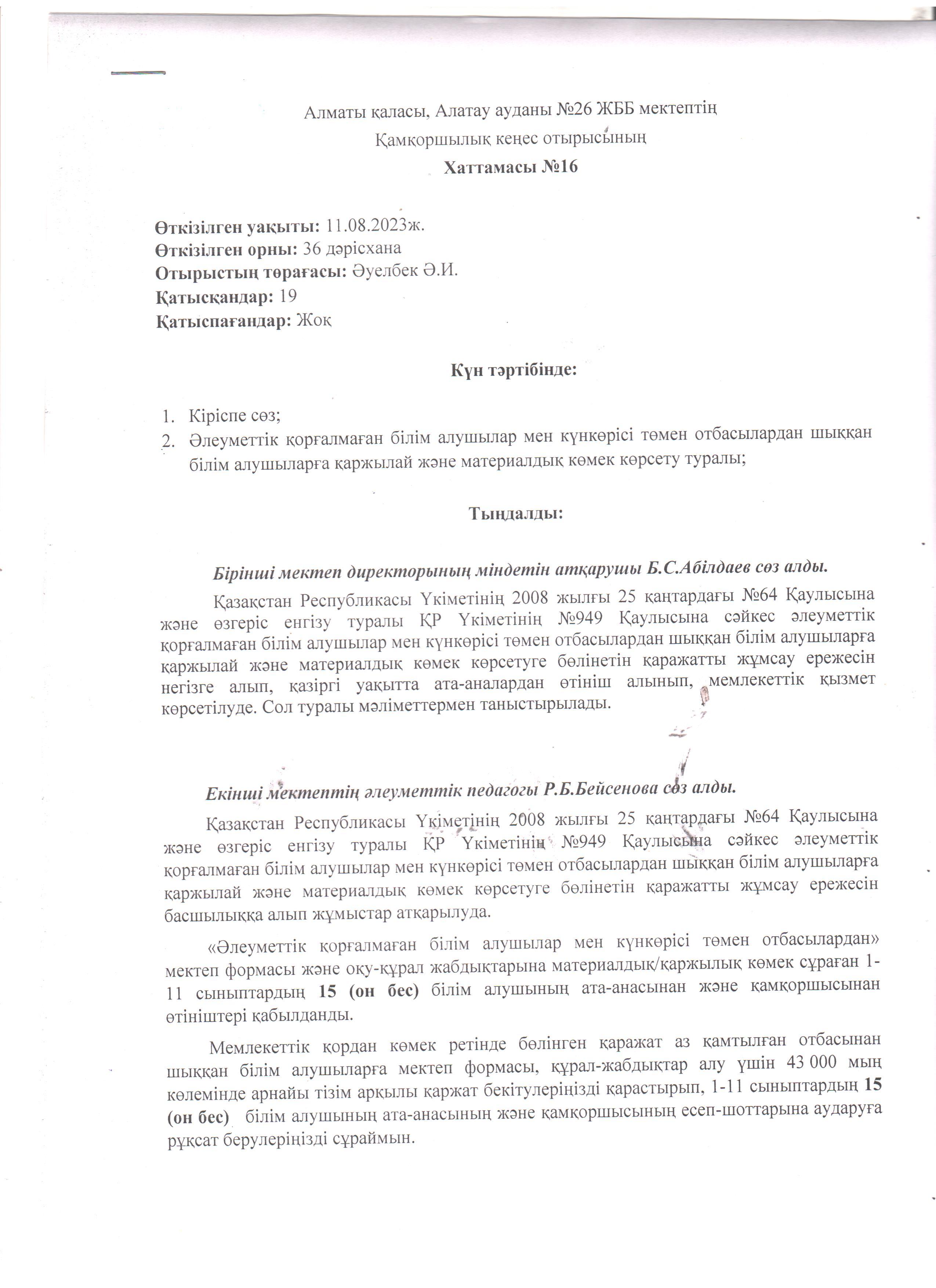 Қамқоршылық кеңес отырысының хаттамасы №16