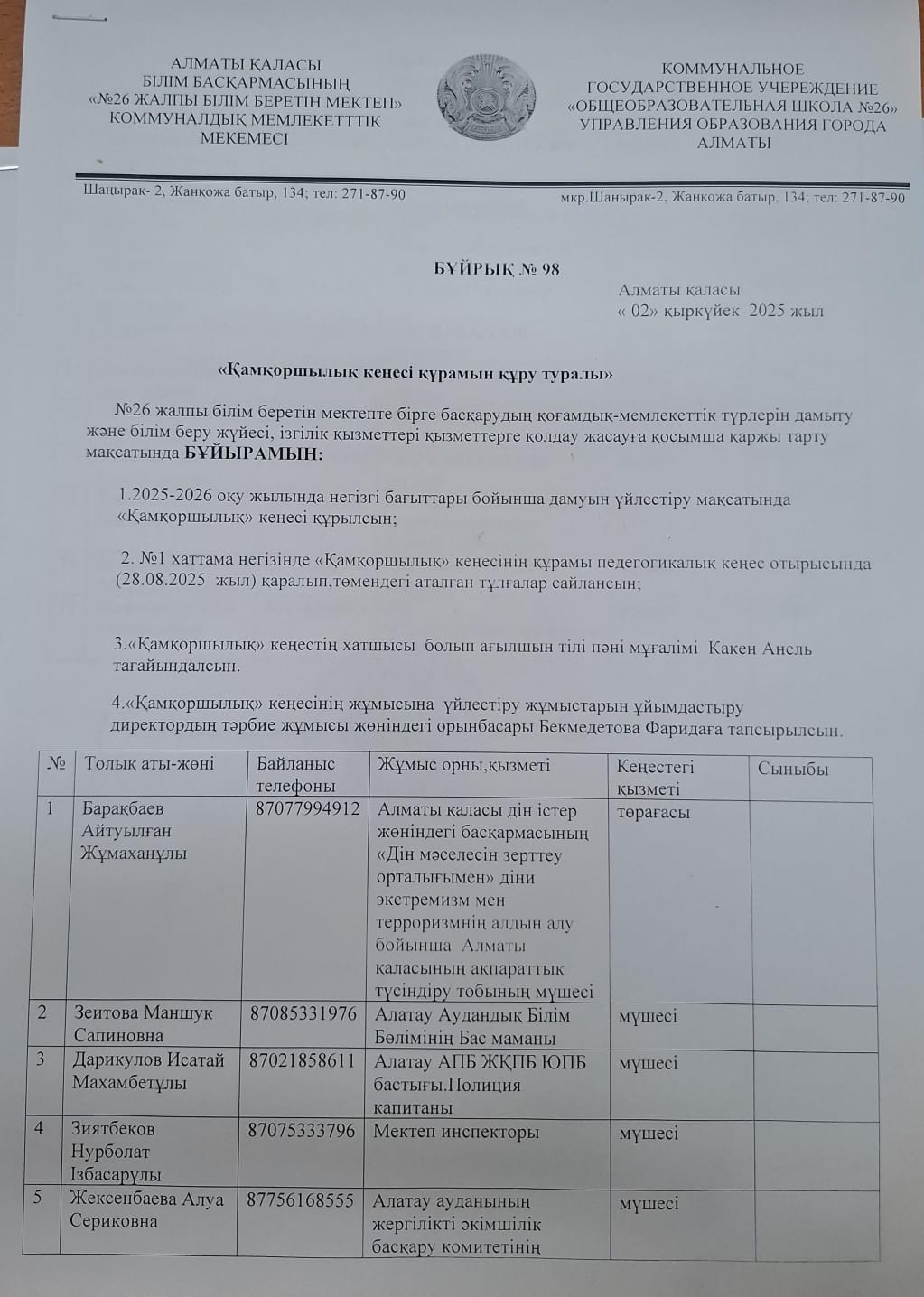 "Қамқоршылық кеңесі құрамын құру туралы" бұйрық №98