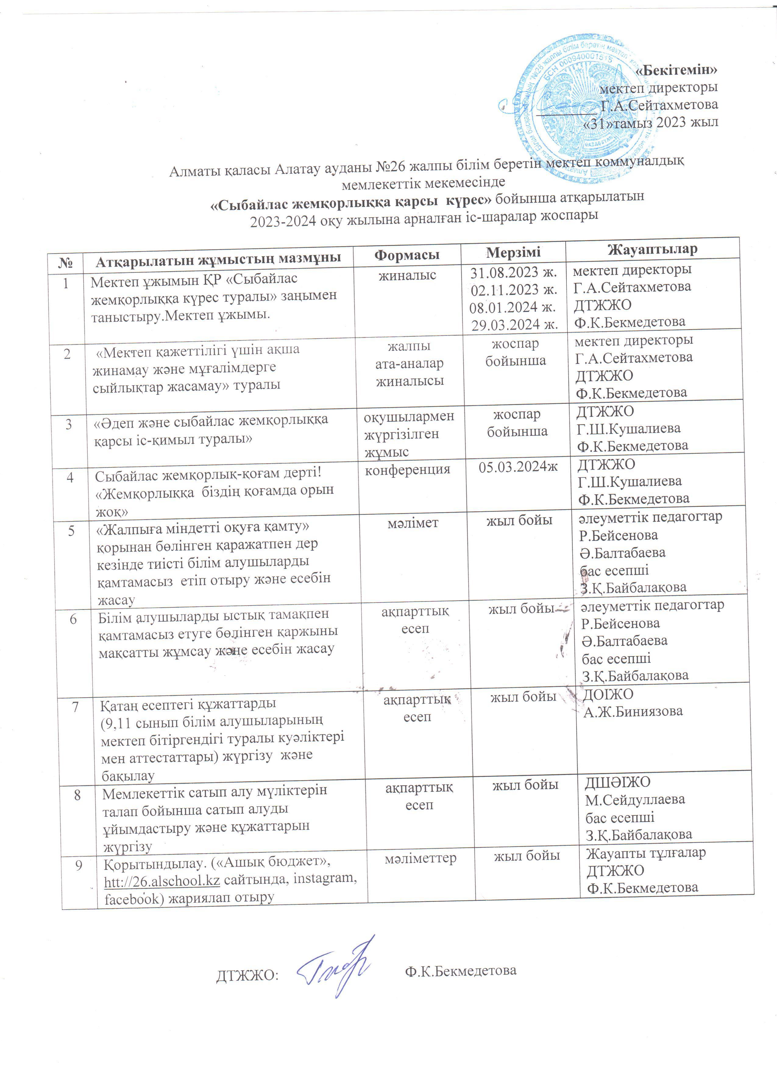 31 август 2023 0 1 2 3 4 5 Сыбайлас жемқорлыққа қарсы күрес бойынша атқарылатын 2023-2024 оқу жылына арналған іс-шаралар жоспары