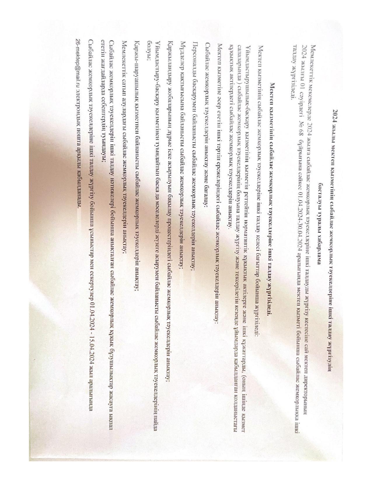 2024 жылы мектеп қызметінің сыбайлас жемқорлық тәуекелдеріне ішкі талдау жүргізудің басталуы туралы хабарлама