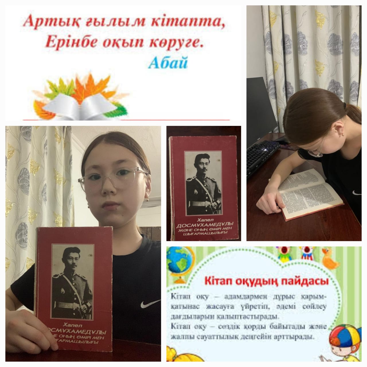 27 декабрь 2024 0 1 2 3 4 5 Алматы қаласы Алатау ауданы 26 жалпы білім беретін мектептің 7"А" сыныбында оқитын Кемелжан Тұмар қыс мезгіліндегі демалыста Халел Досмұхамедұлының өмірі және оның шығармашылығы жайында жазған кітапты оқып танысуда.