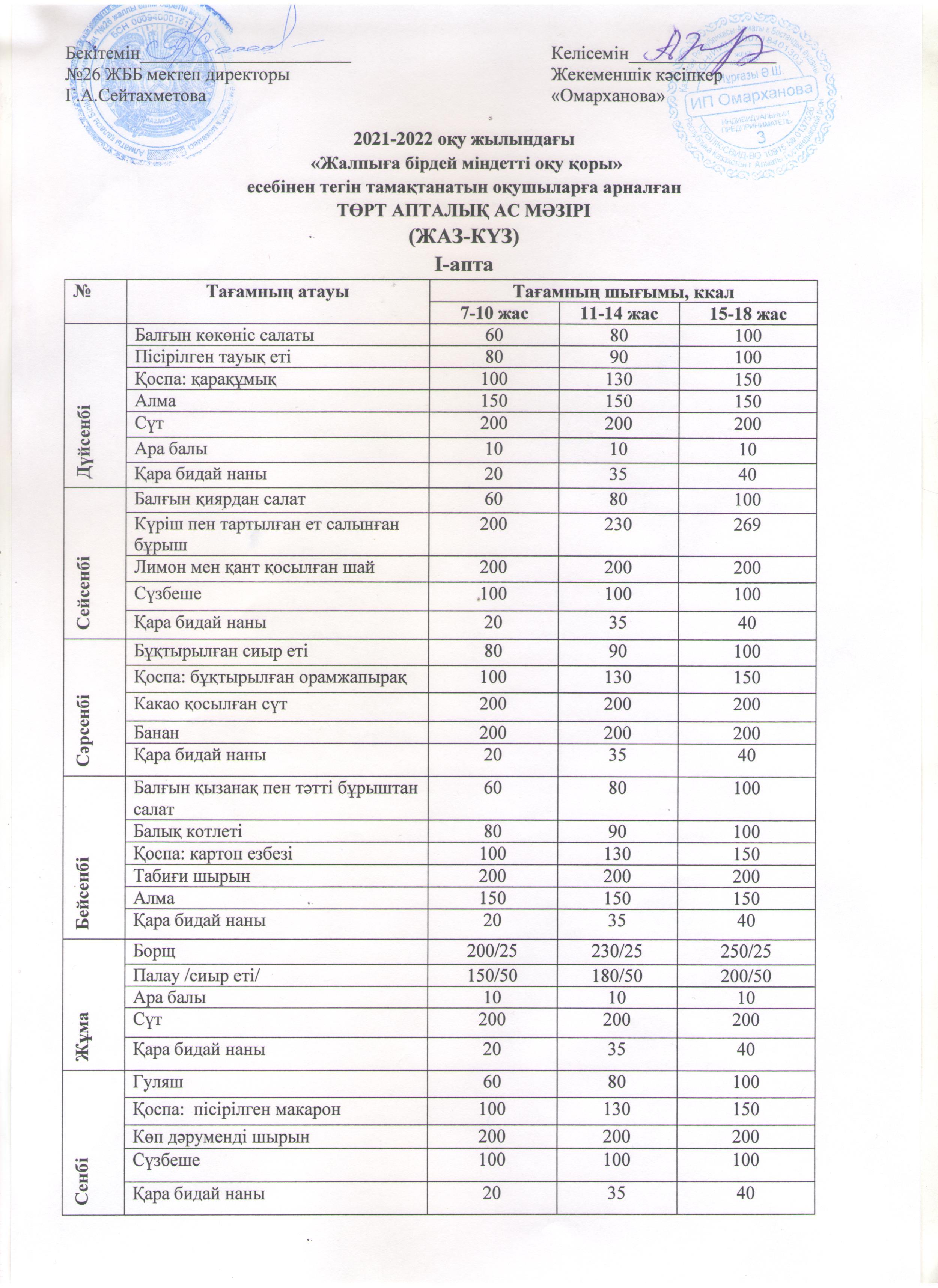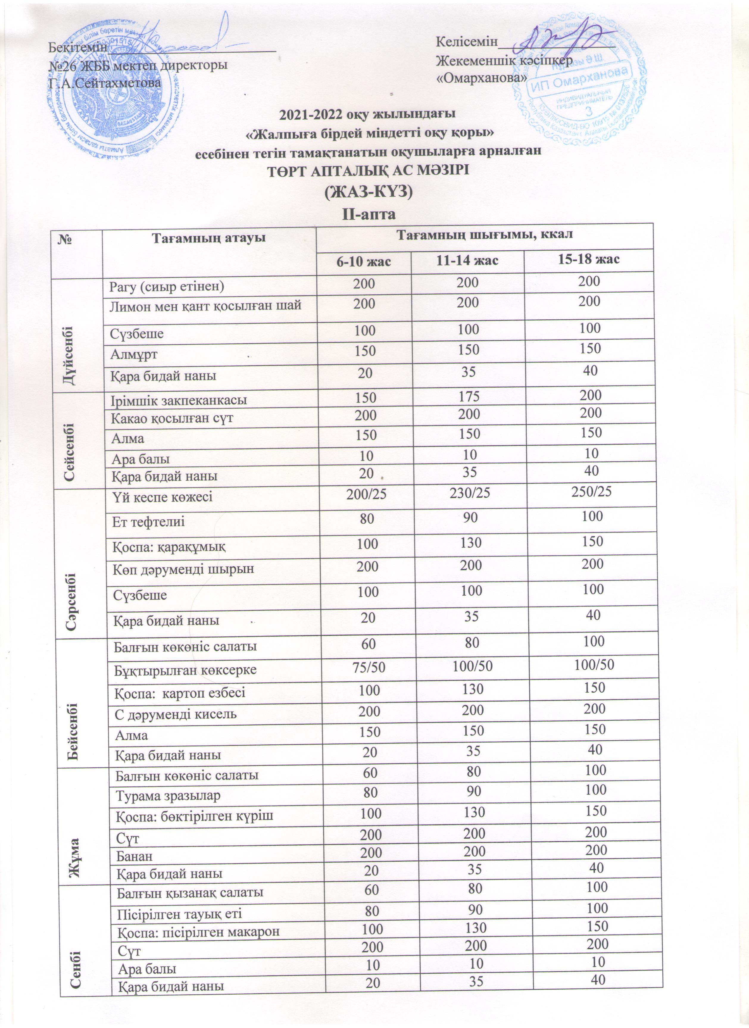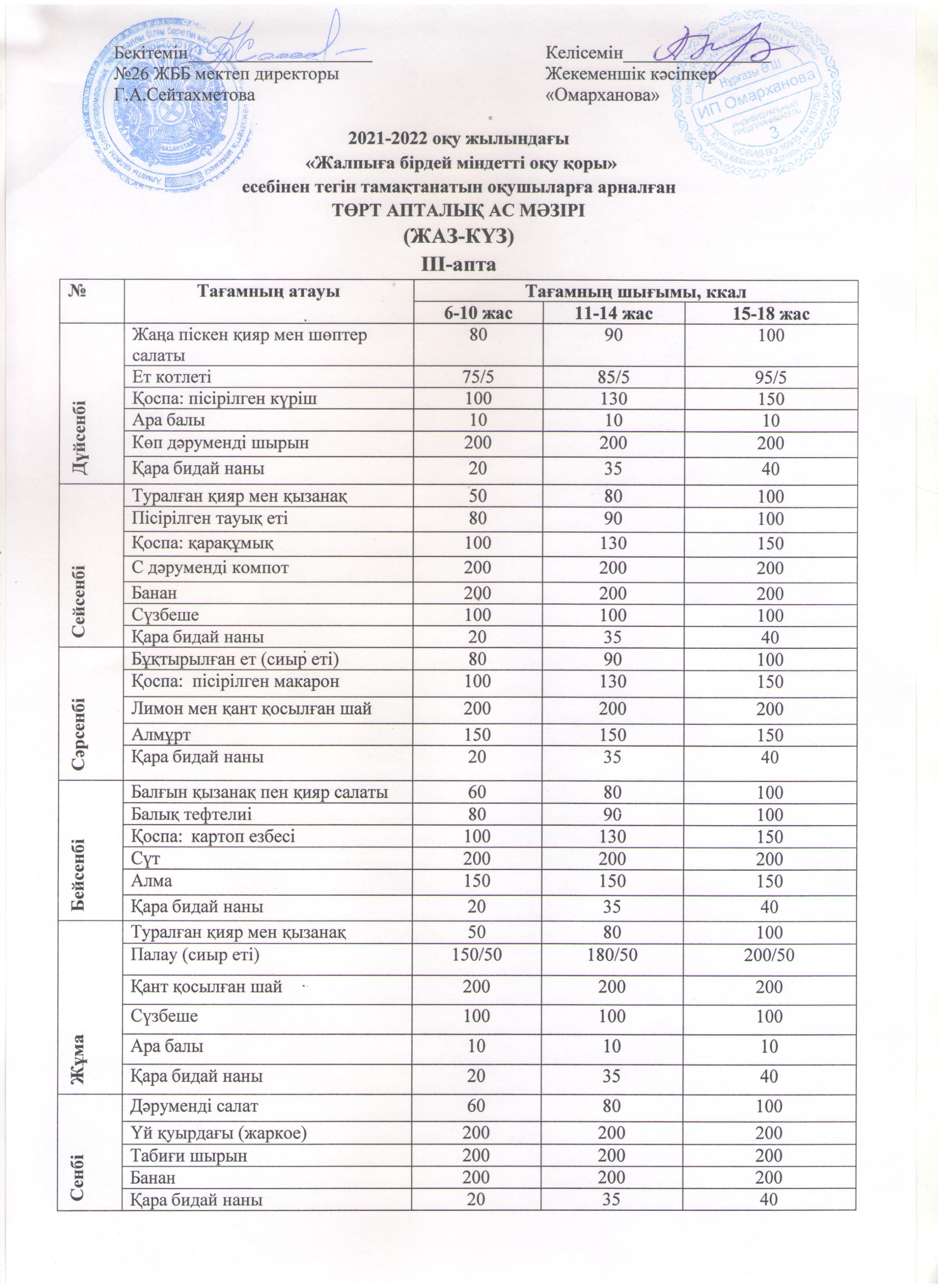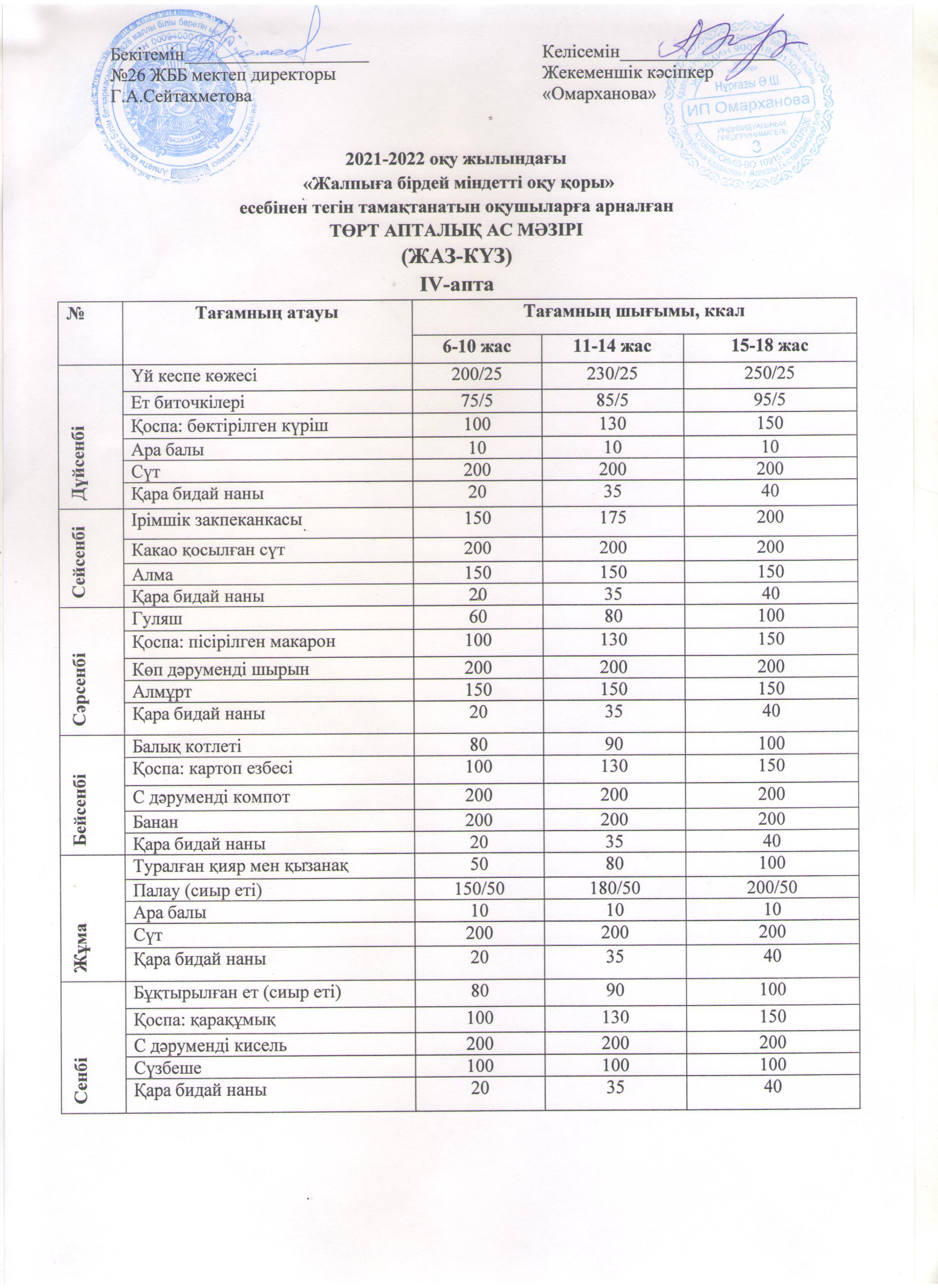 » 2021-2022 ОҚУ ЖЫЛЫ БОЙЫНША ТӨРТ АПТАЛЫҚ АС МӘЗІРІ (ЖАЗ-КҮЗ)