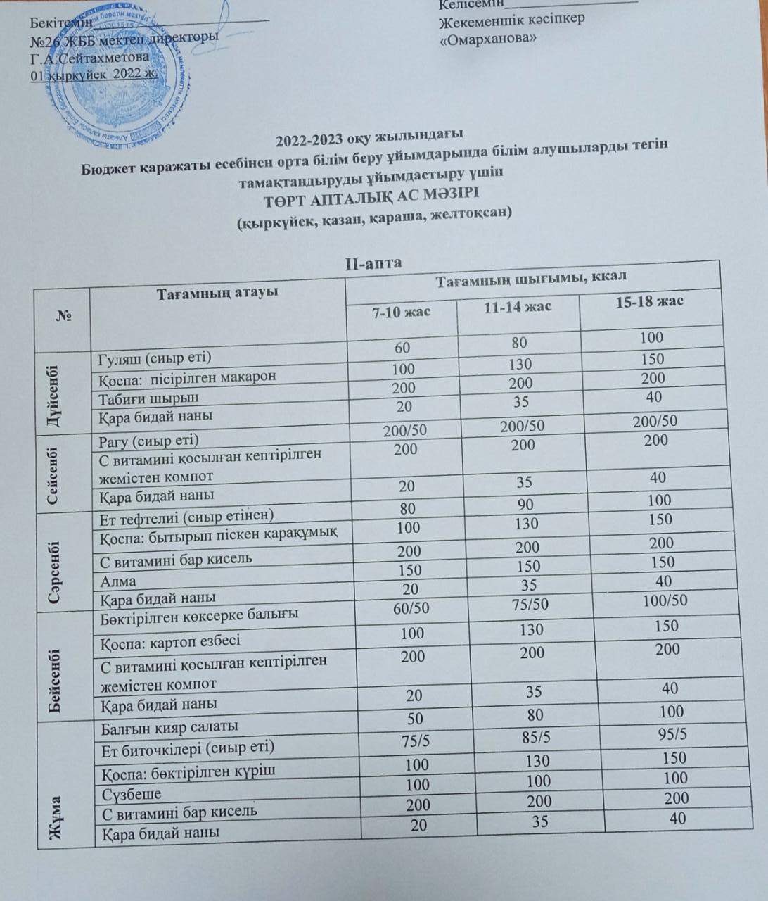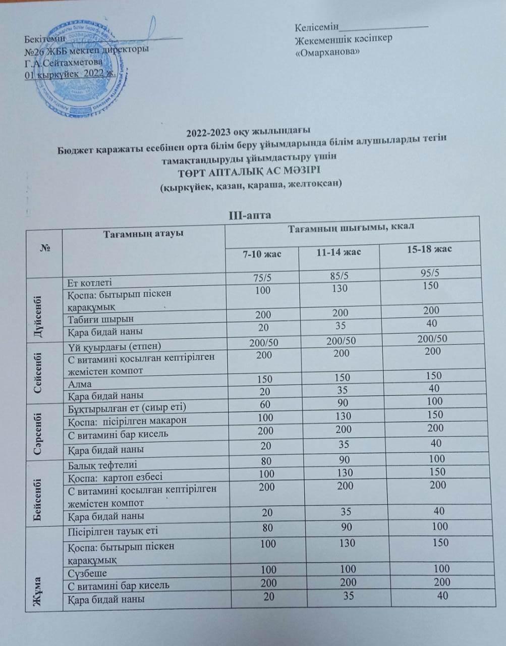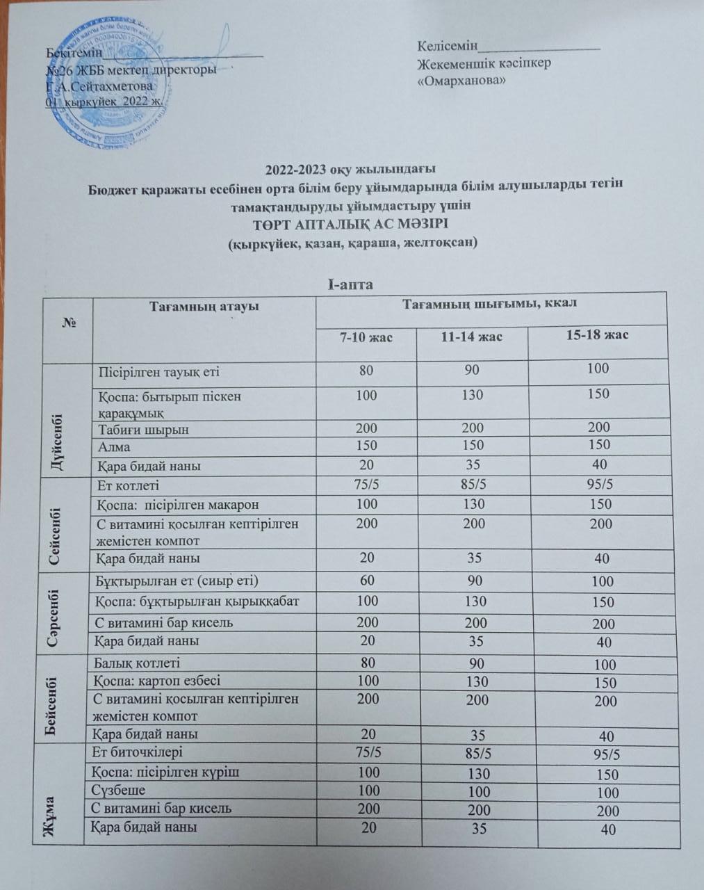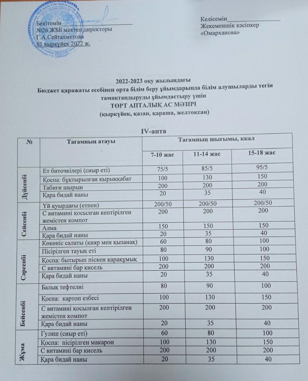 2021-2022 оқу жылындағы «Жалпыға бірдей міндетті оқу қоры» есебінен тегін тамақтанатын оқушыларға арналған ТӨРТ АПТАЛЫҚ АС МӘЗІРІ (ҚЫС-КӨКТЕМ)