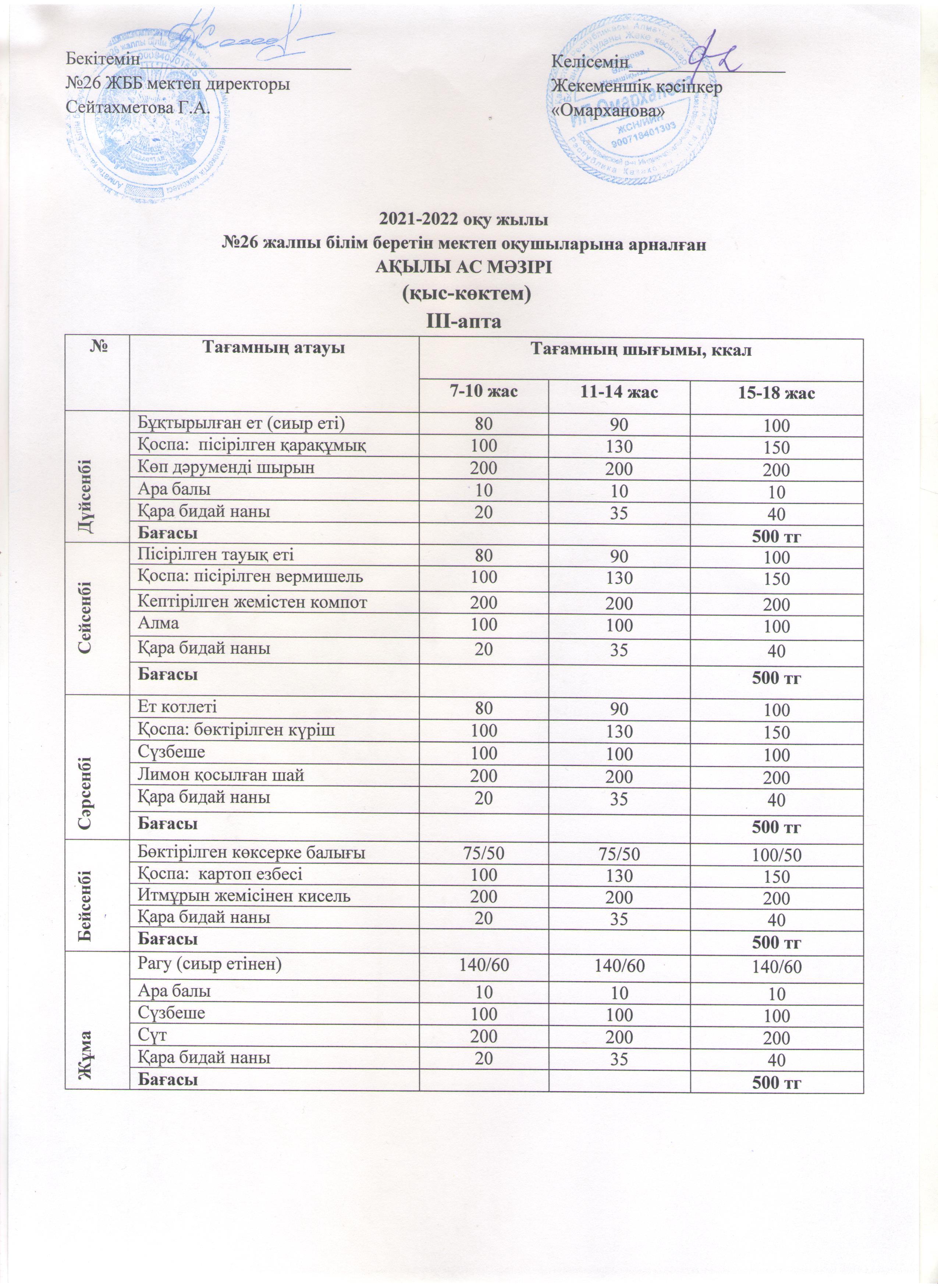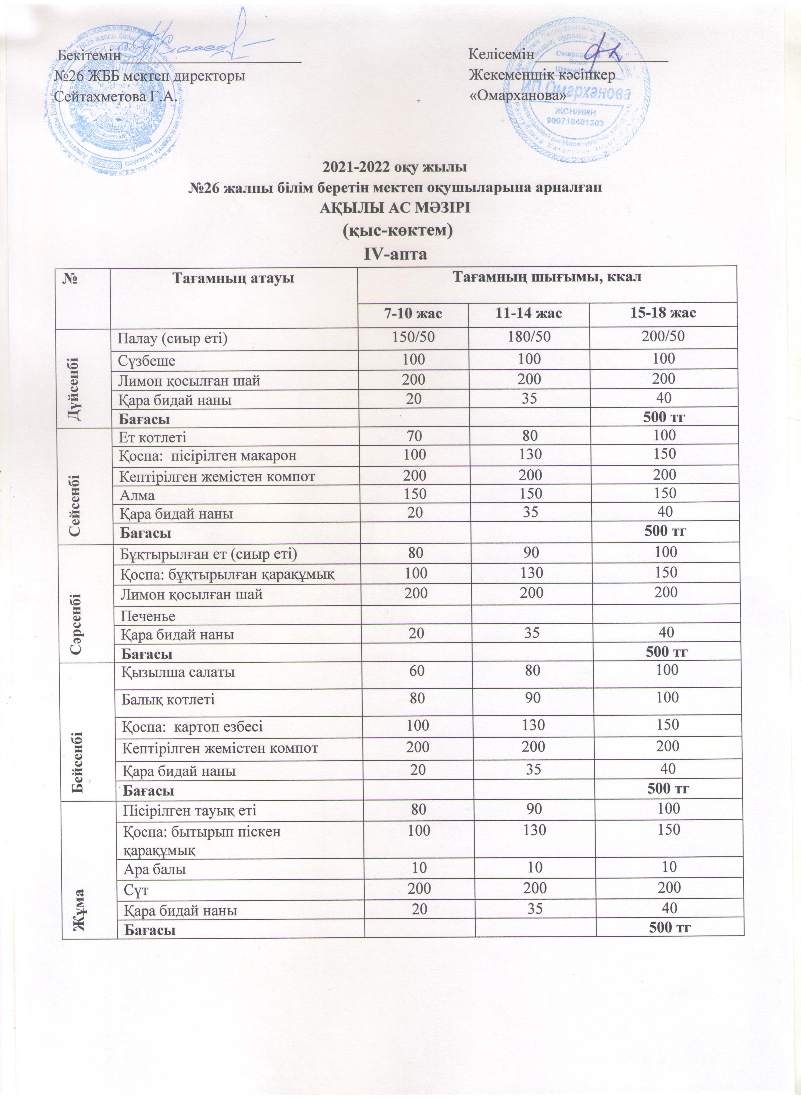 2021-2022 оқу жылындағы «Жалпыға бірдей міндетті оқу қоры» есебінен тегін тамақтанатын оқушыларға арналған ТӨРТ АПТАЛЫҚ АС МӘЗІРІ (ҚЫС-КӨКТЕМ)