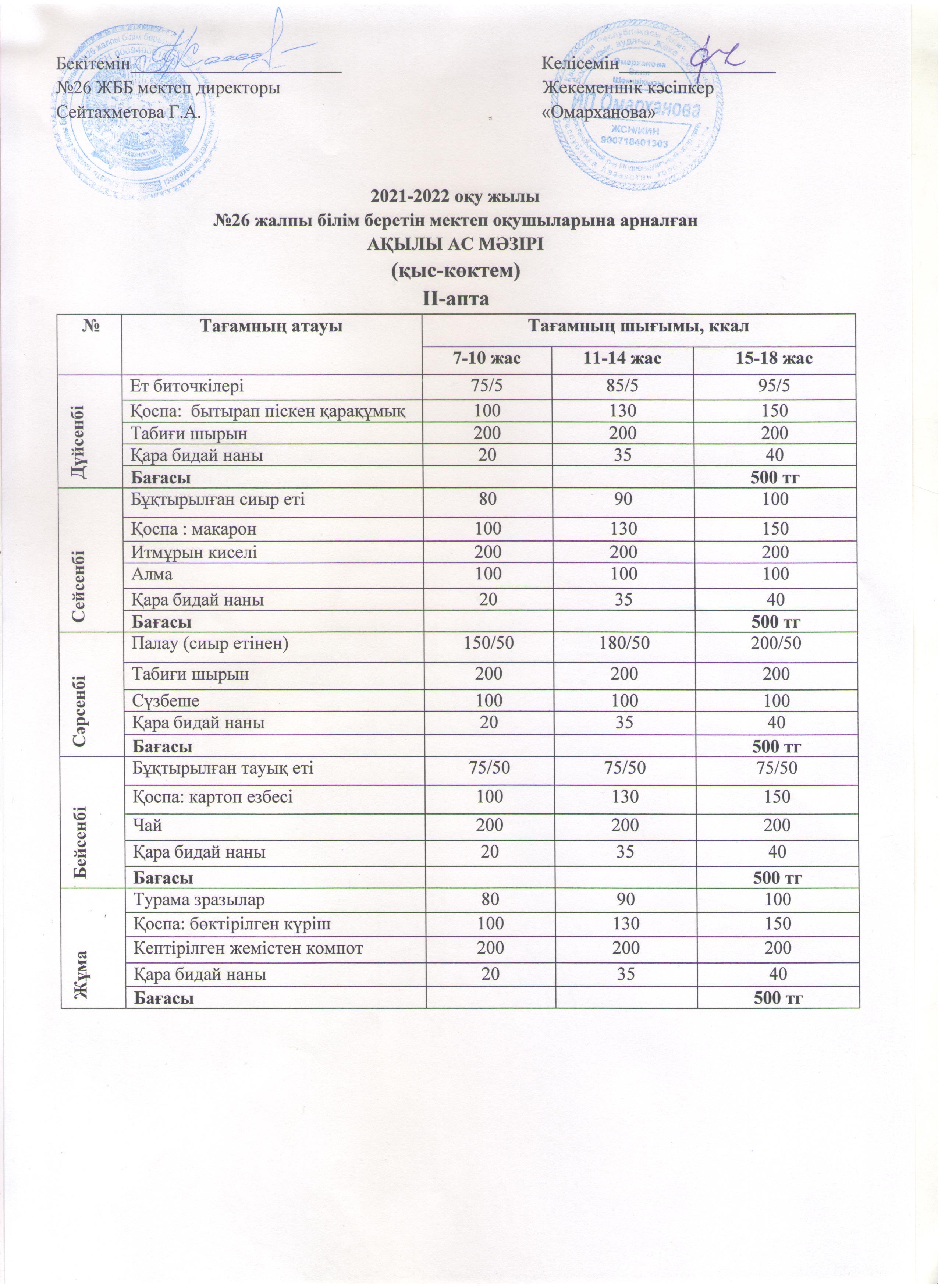 2021-2022 ОҚУ ЖЫЛЫ БОЙЫНША ТӨРТ АПТАЛЫҚ АС МӘЗІРІ (ЖАЗ-КҮЗ)